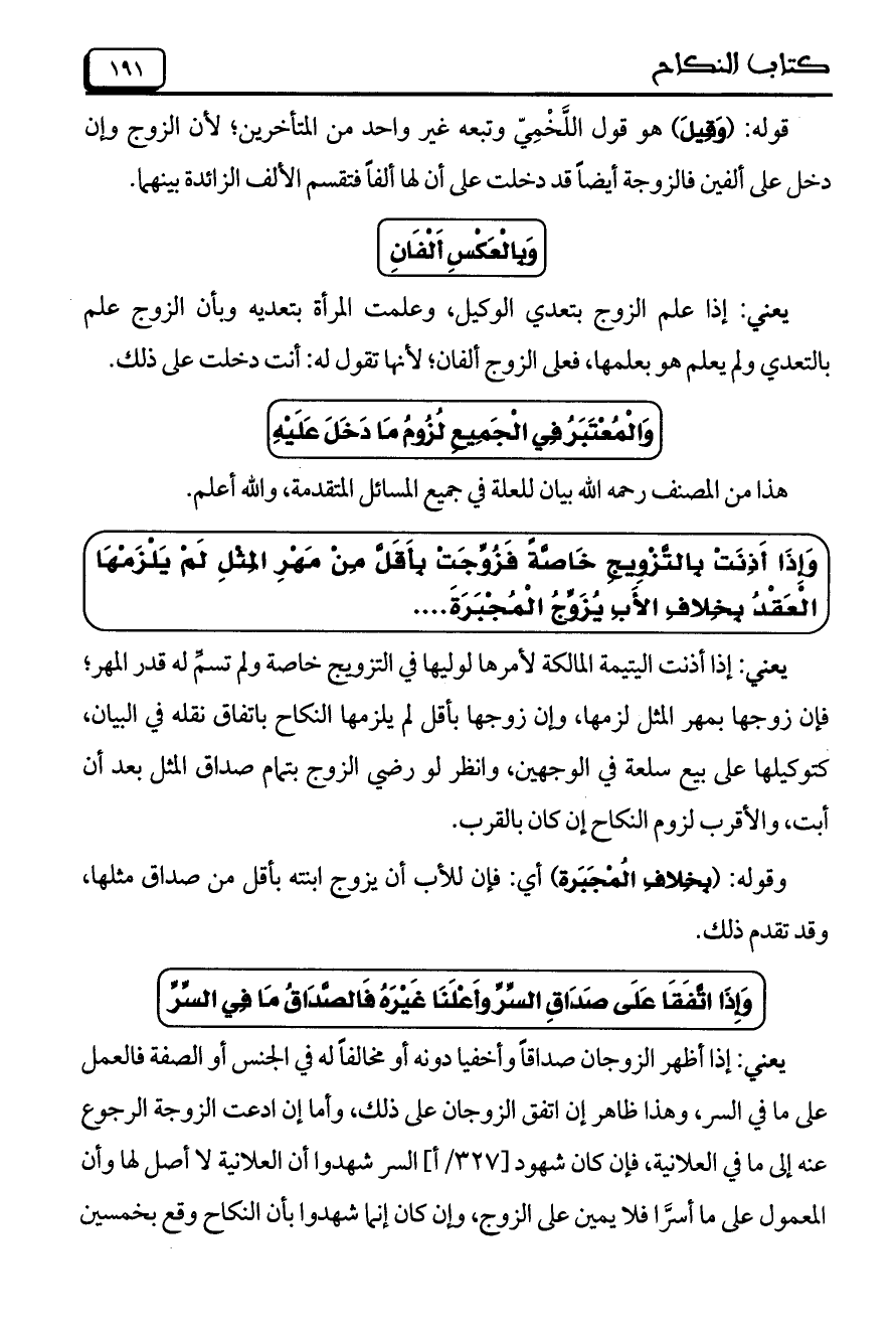 وَإِذَا أَذِنَتْ بِالتَّزْويجِ خَاصَّةً فَزُوِّجَتْ بِأَقَلَّ مِنْ مَهْرِ الْمِثْلِ لَمْ يَلْزَمْهَا الْعَقْدُ بِخِلافِ الأَبِ يُزَوِّجُ الْمُجْبَرَةَ ..