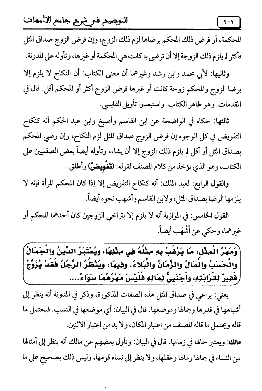 وثانيها: لأبي محمد وابن رشد وغيرهما أن معنى الكتاب: أن النكاح لا يلزم إلا برضا لازوج والمحكم زوجة كانت أو غيرها فرض الزوج أكثر أو المحكم أقل. قال في المقدمات: وهو ظاهر الكتاب. واستبعدوا تأويل القابسي.