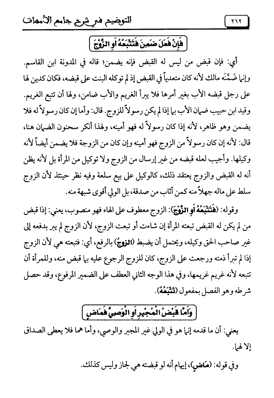 وقوله: (فَتَتْبَعُهُ أَوِ الزَّوْجَ): الزوج معطوف على الهاء فهو منصوب، يعني: إذا قبض من لم يكن له القبض تبعته المرأة إن شاءت أو تبعت الزوج، لأن الزوج لم يبر بدفعه إلى غير صاحب الحق وكيله، ويحتمل أن يضبط (الزوجُ) بالرفع، أي: فتبعته هي لأن الزوج إذا لم تبرأ ذمته ورجعت على الزوج، كان للزوج الرجوع عليه بما قبض منه، وللمرأة أن تتبعه لأنه غريم غريمها، وفي هذا الوجه الثاني العطف على الضمير المرفوع، وقد حصل شرطه وهو الفصل بمفعول (تَتْبَعُهُ).