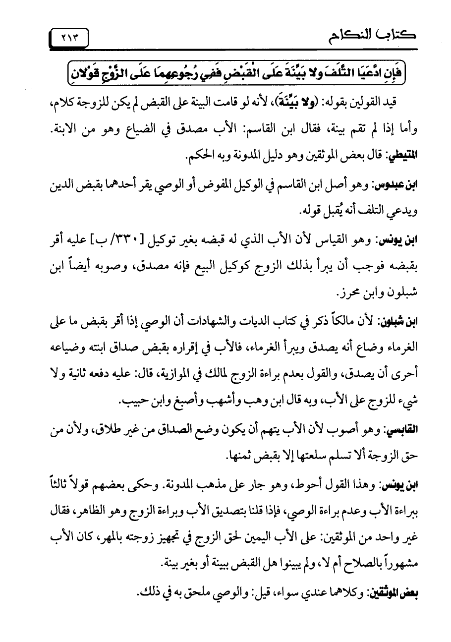 ابن شبلون: لأن مالكاً ذكر في كتاب الديات والشهادات أن الوصي إذا أقر بقبض ما على الغرماء وضاع أنه يصدق ويبرأ الغرماء، فالأب في إقراره بقبض صداق ابنته وضياعه أحرى أن يصدق، والقول بعدم براءة الزوج لمالك في الموازية، قال: عليه دفعه ثانية ولا شيء للزوج على الأب، وبه قال ابن وهب وأشهب وأصبغ وابن حبيب.