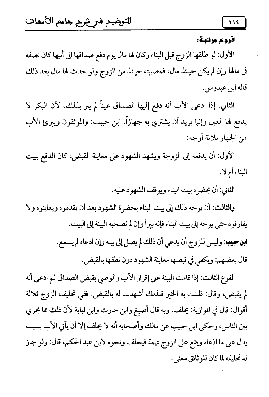 الثاني: إ ذا ادعى الأب أنه دفع إليها الصداق عيناً لم يبر بذلك، لأن البكر لا يدفع لها العين وإنما يريد أن يشتري به جهازاً. ابن حبيب: والموثقون ويبرئ الأب من الجهاز ثلاثة أوجه: