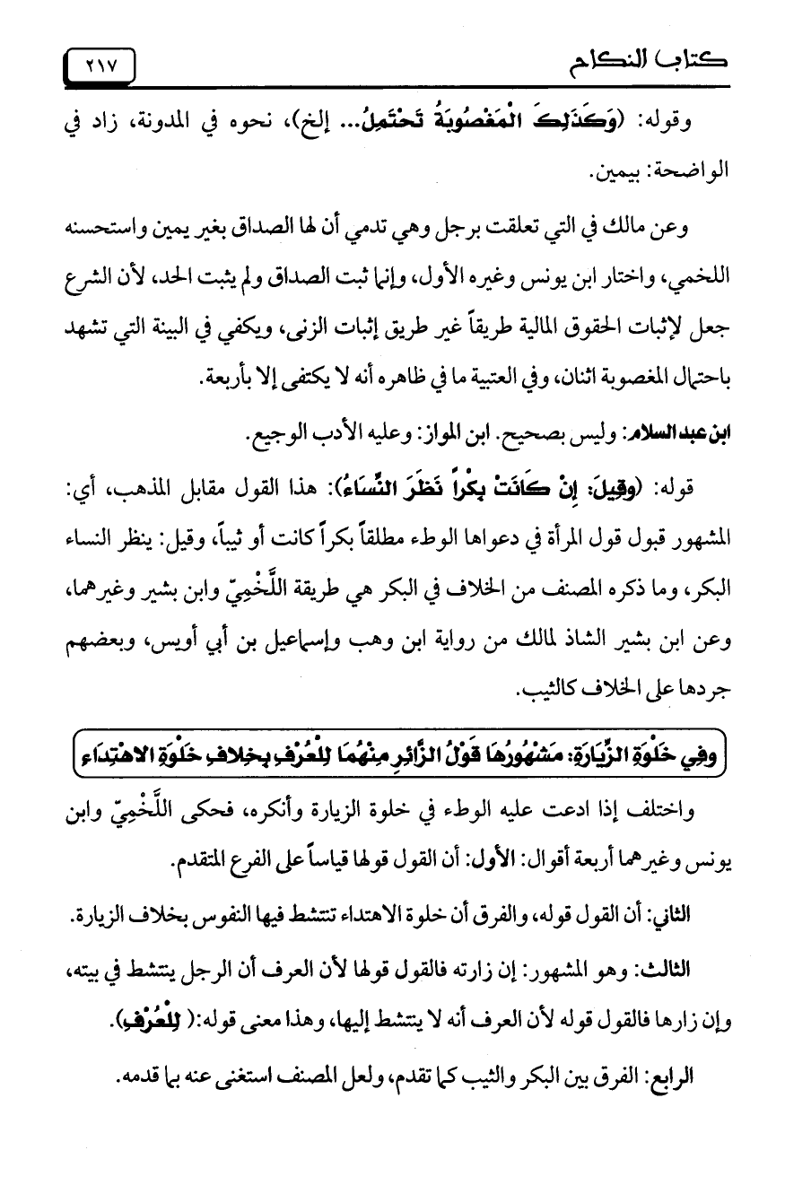 واختلف إذا ادعت عليه الوطء في خلوة الزيارة وأنكره، فحكى اللخمي وابن يونس وغيرهما أربعة أقوال: الأول: أن القول قولها قياساً على الفرع المتقدم.