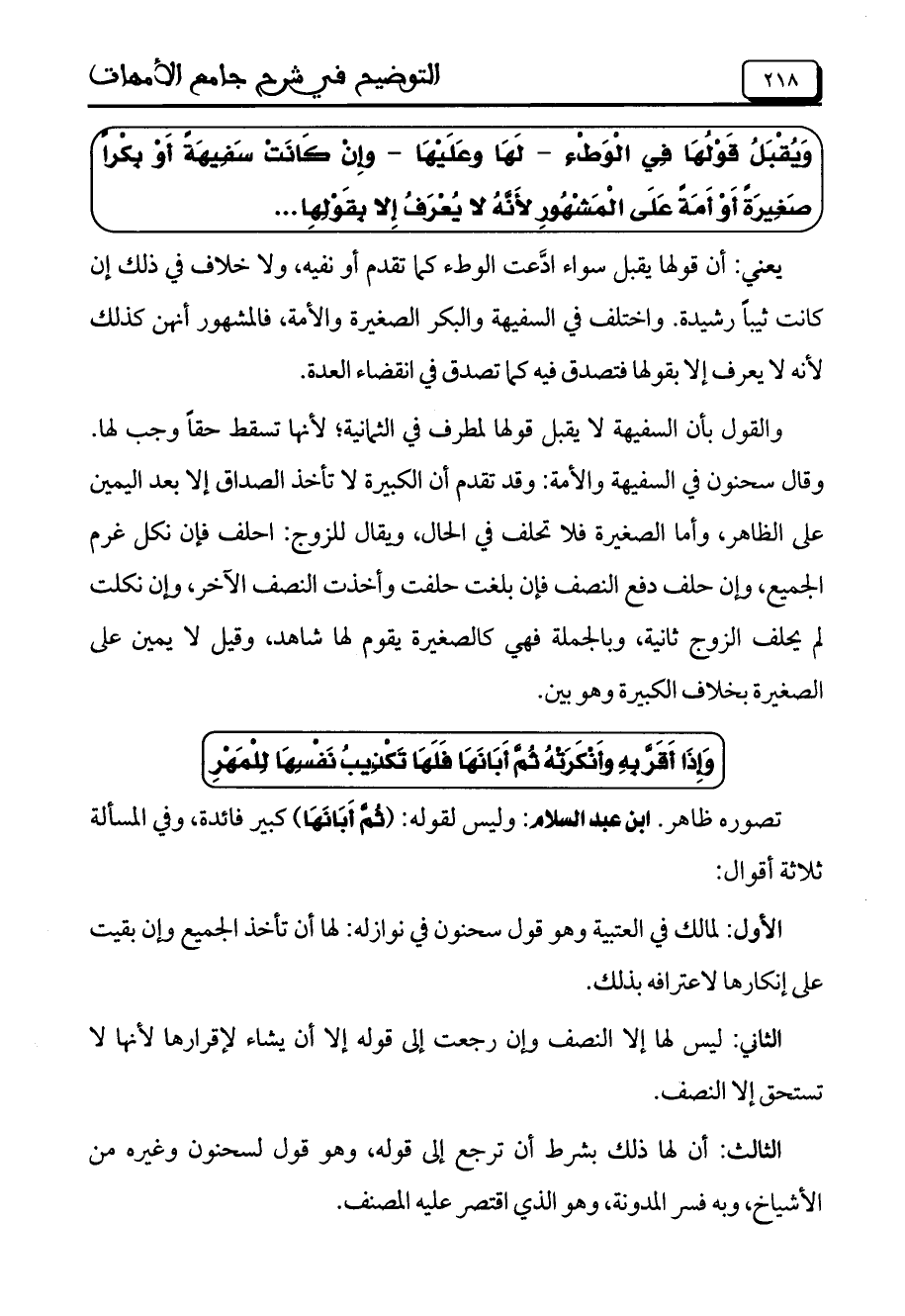 والقول بأن السفيهة لا يقبل قولها لمطرف في الثمانية؛ لأنها تسقط حقاً وجب لها. وقال سحنون في السفيهة والأمة: وقد تقدم أن الكبيرة لا تأخذ الصداق إلا بعد اليمين على الظاهر، وأما الصغيرة فلا تحلف في الحال، ويقال للزوج: احلف فإن نكل غرم الجميع، وإن حلف دفع النصف فإن بلغت حلفت وأخذت النصف الآخر، وإن نكلت لم يحلف الزوج ثانية، وبالجملة فهي كالصغيرة يقوم لها شاهد، وقيل لا يمين على الصغيرة بخلاف الكبيرة وهو بين.