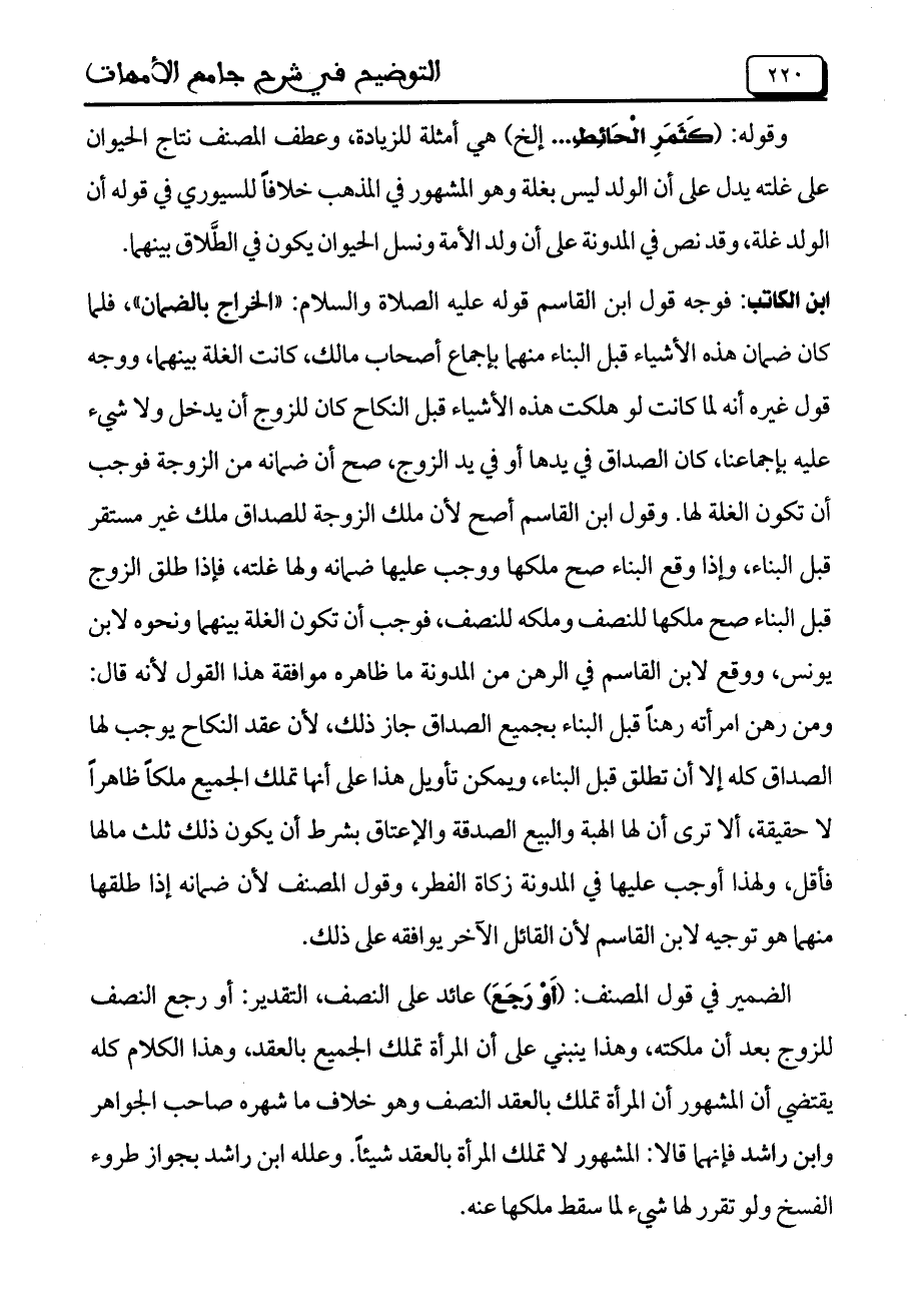 ابن الكاتب: فوجه قول ابن القاسم قوله عليه الصلاة والسلام: "الخراج بالضمان"، فلما كان ضمان هذه الأشياء قبل البناء منهما بإجماع أصحاب مالك، كانت الغلة بينهما، ووجه قول غيره أنه لما كانت لو هلكت هذه الأشياء قبل النكاح كان للزوج أن يدخل ولا شيء عليه بإجماعنا، كان الصداق في يدها أو في يد الزوج، صح أن ضمانه من الزوجة فوجب أن تكون الغلة لها. وقول ابن القاسم أصح لأن ملك الزوجة للصداق ملك غير مستقر قبل البناء، وإذا وقع البناء صح ملكها ووجب عليها ضمانه ولها غلته، فإذا طلق الزوج قبل البناء صح ملكها للنصف وملكه للنصف، فوجب أن تكون الغلة بينهما ونحوه لابن يونس، ووقع لابن القاسم في الرهن من المدونة ما ظاهره موافقة هذا القول لأنه قال: ومن رهن امرأته رهناً قبل البناء، ويمكن تأويل هذا على أنها تملك الجميع ملكاً ظاهراً لا حقيقة، ألا ترى أن لها الهبة والبيع الصدقة والإعتاق بشرط أن يكون ذلك ثلث مالها فأقل، ولهذا أوجب عليها في المدونة زكاة الفطر، وقول المصنف لأن ضمانه إذا طلقها منهما هو توجيه لابن القاسم لأن القائل الآخر يوافقه على ذلك.