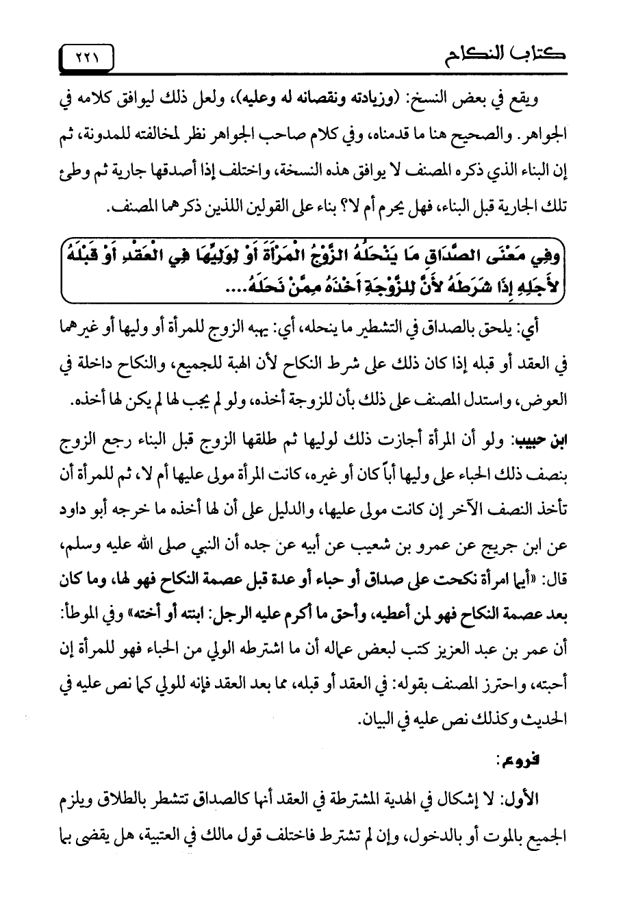 ابن حبيب: ولو أن المرأة أجازت ذلك لوليها ثم طلقها الزوج قبل البناء رجع الزوج بنصف ذلك الحباء على وليها أباً كان أو غيره، كانت المرأة مولى عليها أم لا، ثم للمرأة أن تأخذ النصف الآخر إن كانت مولى عليها، والدليل على أن لها أخذه ما خرجه أبو داود عن ابن جريج عن عمرو بن شعيب عن أبيه عن جده أن النبي صلى الله عليه وسلم، قال: "أيما امرأة نكحت على صداق أو حباء أو عدة قبل عصمة النكاح فهو لها، وما كان بعد عصمة النكاح فهو لمن أعطيه، وأحق ما أكرم عليه الرجل: ابنته أو أخته" وفي الموطأ: أن عمر بن عبد العزيز كتب لبعض عماله أن ما اشترطه الولي من الحباء فهو للمرأة إن أحبته، واحترز المصنف بقوله: في العقد أو قبله، مما بعد العقد فإنه للولي كما نص عليه في الحديث وكذلك نص عليه في البيان.
