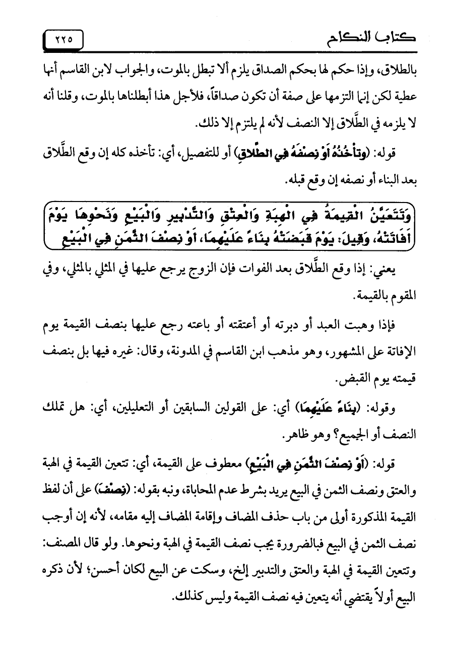 قوله: (أَوْ نِصْفَ الثَّمَنِ فِي الْبَيْعِ) معطوف على القيمة، أي: تتعين القيمة في الهبة والعتق ونصف الثمن في البيع يريد بشرط عدم المحاباة، ونبه بقوله: (نِصْفَ) على أن لفظ القيمة المذكورة أولى من باب حذف المضاف وإقامة المضاف إليه مقامه، لأنه إن أوجب نصف الثمن في البيع فبالضرورة يجب نصف القيمة في الهبة ونحوها. ولو قال المصنف: وتتعين القيمة في الهبة والعتق والتدبير إلخ، وسكت عن البيع لكان أحسن؛ لأن ذكره البيع أولاً يقتضي أنه يتعين فيه نصف القيمة وليس كذلك.