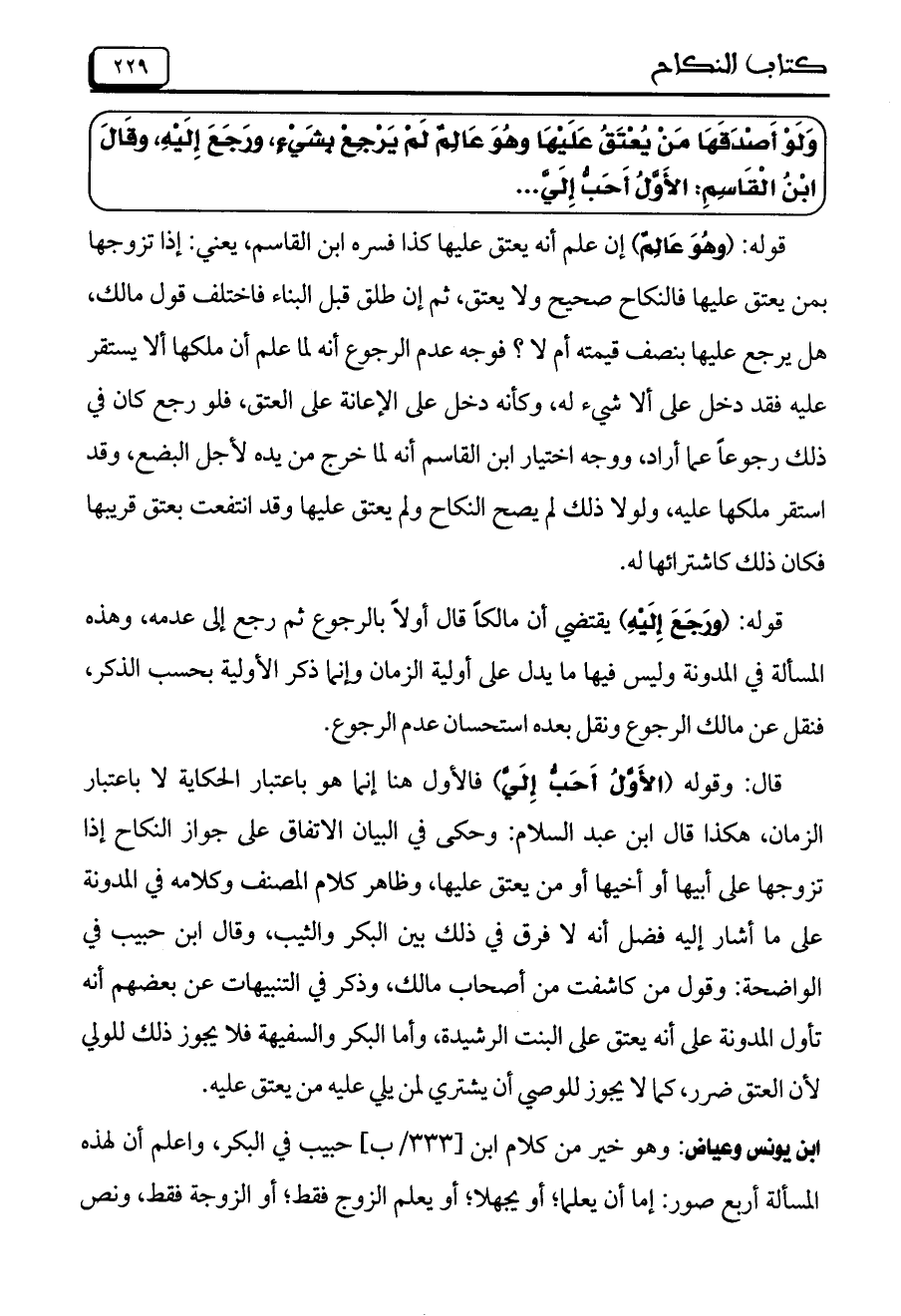 وَلَوْ أَصْدَقَهَا مَنْ يُعْتَقُ عَلَيْهَا وهُوَ عَالِمُ لَمْ يَرْجِعْ بِشَيْءِ، ورَجَعَ إِلَيْهِ، وقَالَ ابْنُ الْقَاسِمِ: الأَوَّلُ أَحَبُّ إِلَيَّ ..