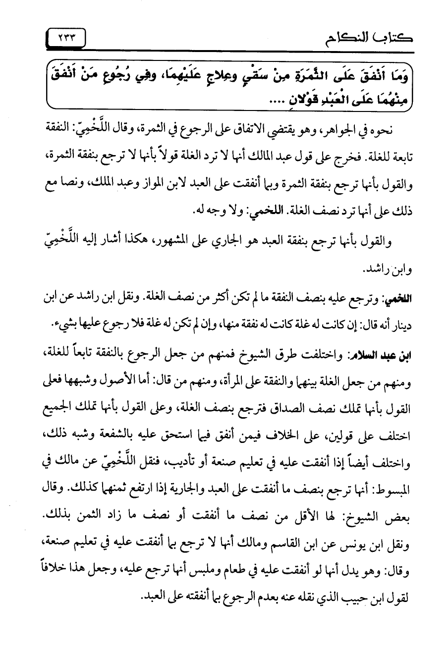 ابن عبد السلام: واختلفت طرق الشيوخ فمنهم من جعل الرجوع بالنفقة تابعاً للغلة، ومنهم من جعل الغلة بينهما والنفقة على المرأة، ومنهم من قال: أما الأصول وشبهها فعلى القول بأنها تملك نصف الصداق فترجع بنصف الغلة، وعلى القول بأنها تملك الجميع اختلف على قولين، على الخلاف فيمن أنفق فيما استحق عليه بالشفعة وشبه ذلك، واختلف أيضاً إذا أنفقت عليه في تعليم صنعة أو تأديب، فنقل اللخمي عن مالك في المبسوط: أنها ترجع بنصف ما أنفقت على العبد والجارية إذا ارتفع ثمنهما كذلك. وقال بعض الشيوخ: لها الأقل من نصف ما أنفقت أو نصف ما زاد الثمن بذلك ونقل ابن يونس عن ابن القاسم ومالك أنها لا ترجع بما أنفقت عليه في تعليم صنعة، وقال: وهو يدل أنها لو أنفقت عليه في طعام وملبس أنها ترجع عليه، وجعل هذا خلافاً لقول ابن حبيب الذي نقله عنه بعدم الرجوع بما أنفقته على العبد.