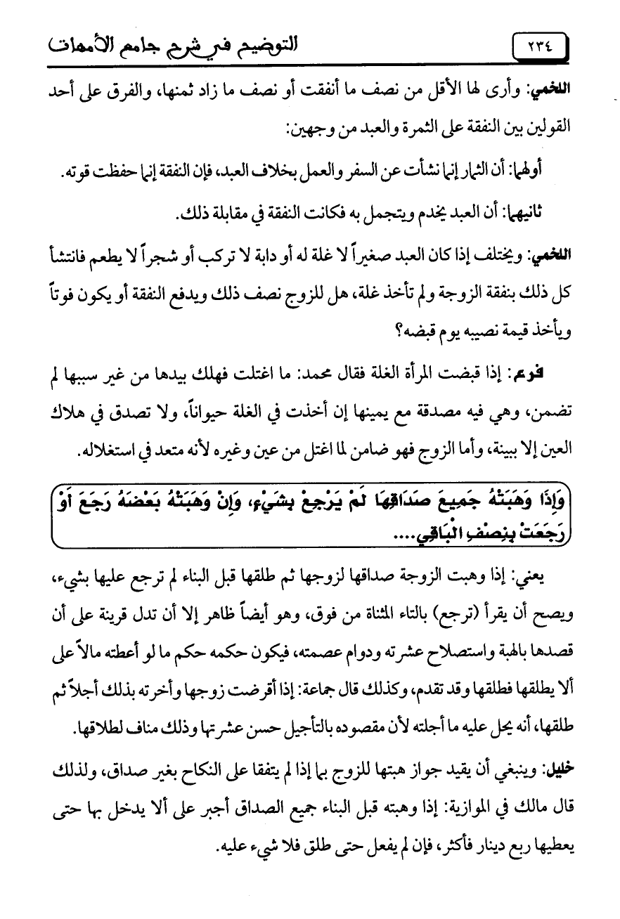 اللخمي: ويختلف إذا كان العبد صغيراً لا غلة له أو دابة لا تركب أو شجراً لا يطعم فانتشأ كل ذلك بنفقة الزوجة ولم تأخذ غلة، هل للزوج نصف ذلك ويدفع النفقة أو يكون فوتاً ويأخذ قيمة نصيبه يوم قبضه؟