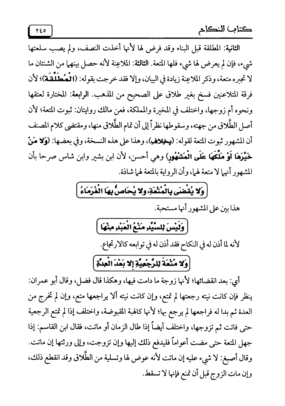 الثانية: المطلقة قبل البناء وقد فرض لها لأنها أخذت النصف، ولم يصب سلعتها شيء، فإن لم يعرض لها شيء فلها المتعة. الثالثة: الملاعنة لأنه حصل بينهما من الشنئان ما لا تجبره متعة، وذكر الملاعنة زيادة في البيان، وإلا فقد خرجت بقوله: (الْمُطَلَّقَةِ) لأن فرقة المتلاعنين فسخ بغير طلاق على الصحيح من المذهب. الرابعة: المختارة لعتقها ونحوه أم زوجها، واخلتف في المخيرة والمملكة، فعن مالك روايتان: ثبوت المتعة؛ لأن أصل الطلاق من جهته، وسقوطها نظراً إلى أن تمام الطلاق منها، ومقتضى كلام المصنف أن المشهور ثبوت المتعة لقوله: (بِخِلافِ) وهذا على هذه النسخة، وفي بعضها: (وَلا مَنْ خَيَّرَهَا أَوْ مَلَّكَهَا عَلَى الْمَشْهُورِ) وهي أحسن، لأن ابن بشير وابن شاس صرحا بأن المشهور أنهما لا متعة لهما، وأن الرواية بالمتعة لهما شاذة.