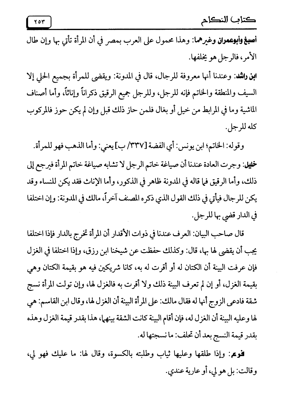 ابن راشد: وعندنا أنها معروفة للرجال، قال في المدونة: ويقضي للمرأة بجميع الحلي إلا السيف والمنطقة والخاتم فإنه للرجل، وللرجل جميع الرقيق ذكراناً وإناثاً، وأما أصناف الماشية وما في المرابط من خيل أو بغال فلمن حاز ذلك قبل وإن لم يكن حوز فالمركوب كله للرجل.