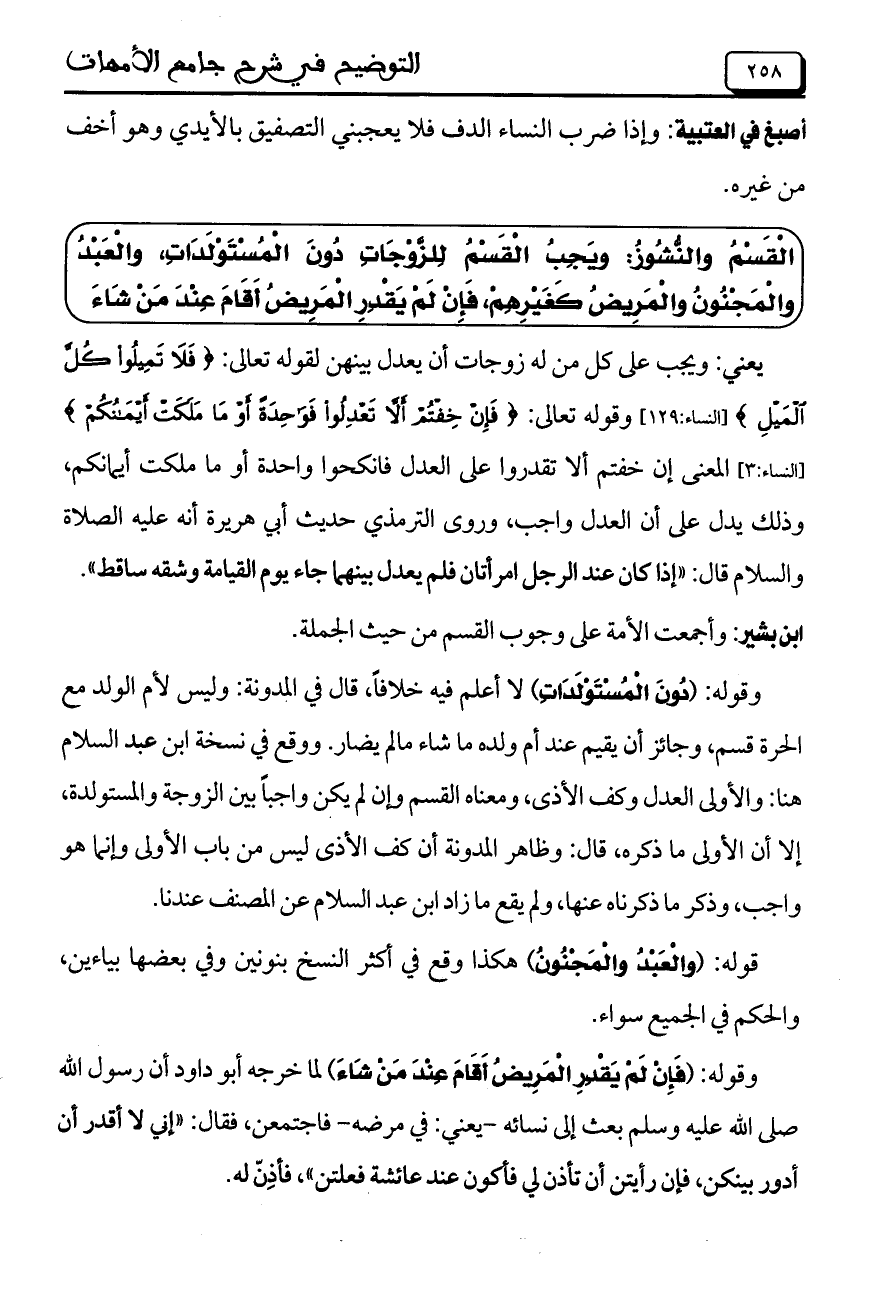 وقوله: (دُونَ الْمُسْتَوْلَدَاتِ) لا أعلم فيه خلافاً، قال في المدونة: وليس لأم الولد مع الحرة قسم، وجائز أن يقيم عند أم ولده ما شاء ما لم يضار. ووقع في نسخة ابن عبد السلام هنا: والأولى العدل وكف الأذى، ومعناه القسم وإن لم يكن واجباً بين الزوجة والمستولدة، إلا أن الأولى ما ذكره، قال: وظاهر المدونة أن كف الأذى ليس من باب الأولى وإنما هو واجب، وذكر ما ذكرناه عنها، ولم يقع ما زاد ابن عبد السلام عن المصنف عندنا.