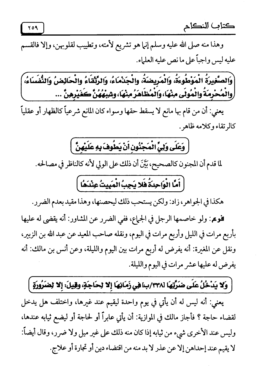 وَالصَّغِيرَةُ الْمَوْطُوءَةُ، وَالْمَرِيضَةُ، والْجَذْمَاءُ، وَالرَّتْقَاءُ وَالْحَائِضُ وَالنُّفَسَاءُ، والْمُحْرِمَةُ والْمُولَى مِنْهَا، وَالْمُظَاهَرُ مِنْهَا، وشِبْهُهُنَّ كَغَيْرِهِنَّ ..