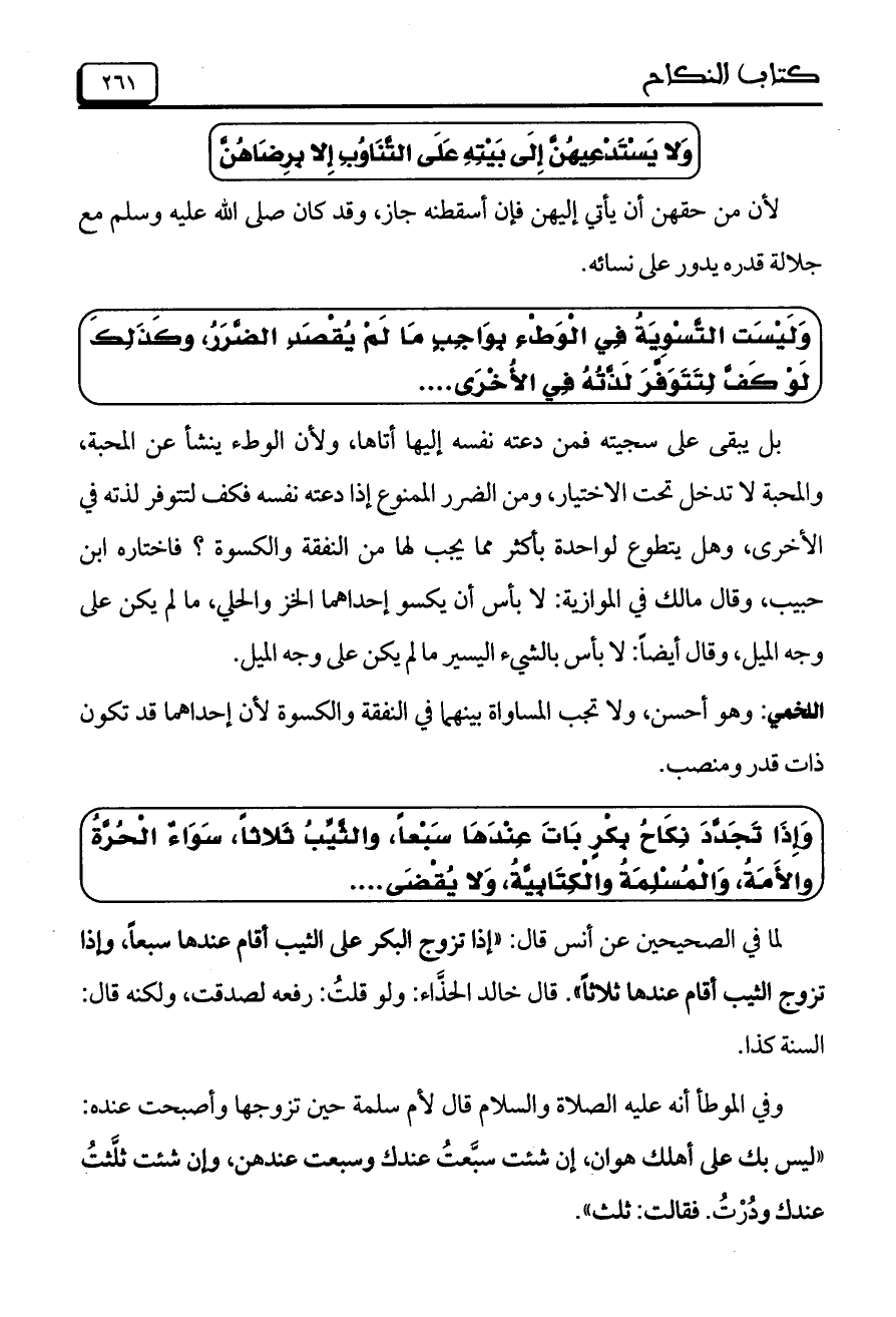 وفي الموطأ أنه عليه الصلاة والسلام قال لأم سلمة حين تزوجها وأصبحت عنده: "ليس بك على أهلك هوان، إن شئت سبعت عندك وسبعت عندهن، وإن شئت ثلثت عندك ودرت. فقالت: ثلث".