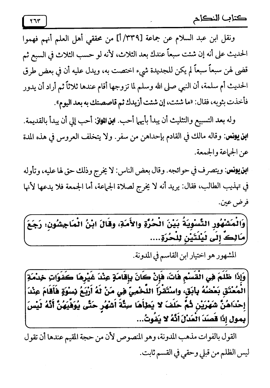 ونقل ابن عبد السلام عن جماعة [339/ أ] من محقق أهل العلم أنهم فهموا الحديث على أنه إن شئت سبعاً عندك بعد الثلاث، لأنه لو حسب الثلاث في السبع ثم قضى لهن سبعاً سبعاً لم يكن للجديدة شيء اخصت به، ويدل عليه أن في بعض طرق الحديث أم سلمة، أن النبي صلى الله عليه وسلم لما تزوجها أقام عندها ثلاثاً ثم أراد أن يدور فأخذت بثوبه، فقال: "ما شئت، إن شئت أزيدك ثم قاصصتك به بعد اليوم".