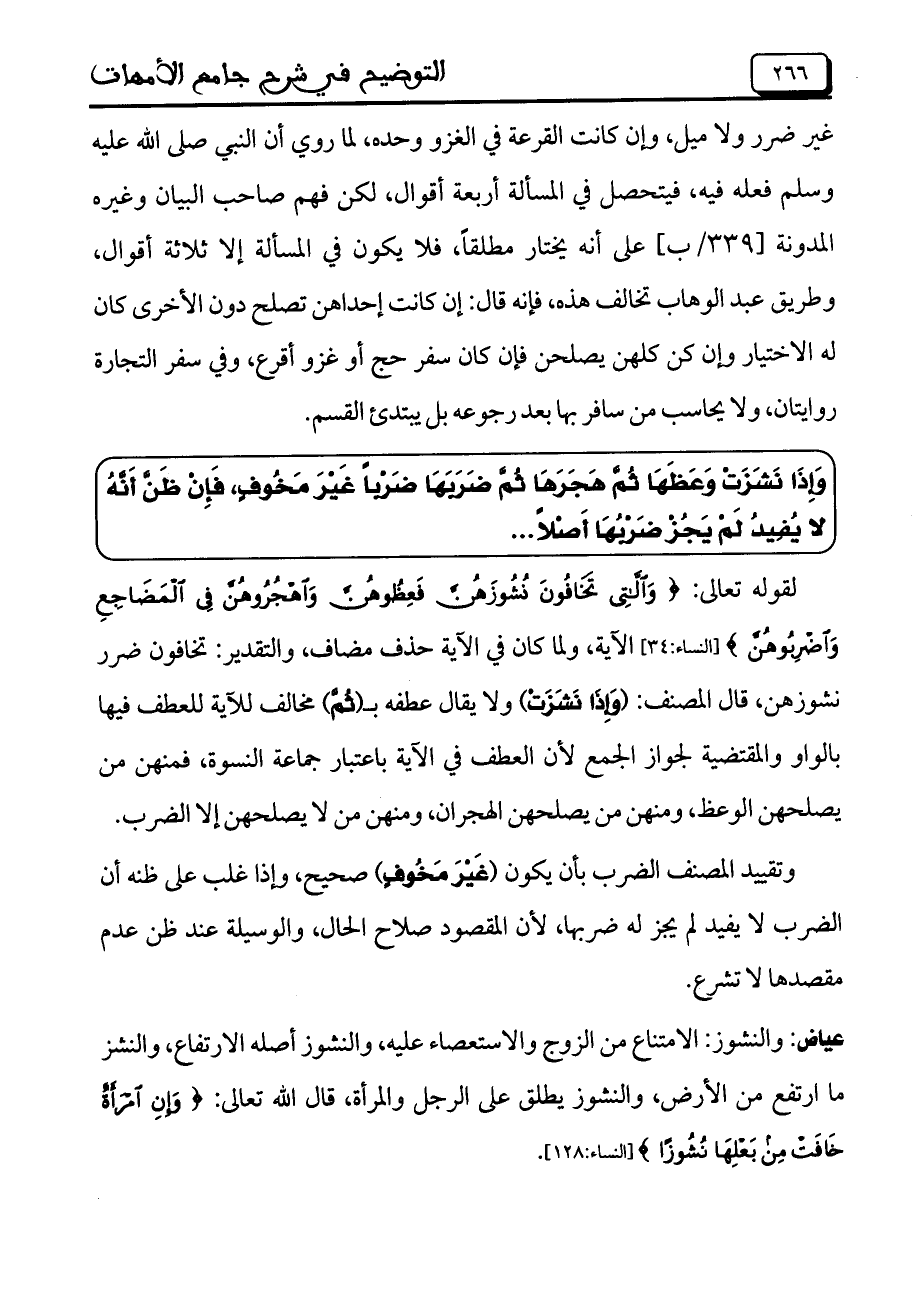 لقوله تعالى: (وَاللاَّتِي تَخَافُونَ نُشُوزَهُنَّ فَعِظُوهُنَّ وَاهْجُرُوهُنَّ فِي الْمَضَاجِعِ وَاضْرِبُوهُنَّ) [النساء: 34] الآية، ولما كان في الآية حذف مضاف، والتقدير: تخافون ضرر نشوزهن، قال المصنف: (وَإِذَا نَشَزَتْ) ولا يقال عطفه بـ (ثُمَّ) مخالف للآية للعطف فيها بالواو والمقتضية لجواز الجمع لأن العطف في الآية باعتبار جماعة النسوة، فمنهن من يصلحهن الوعظ، ومنهن من يصلحهن الهجران، ومنهن من لا يصلحهن إلا الضرب.