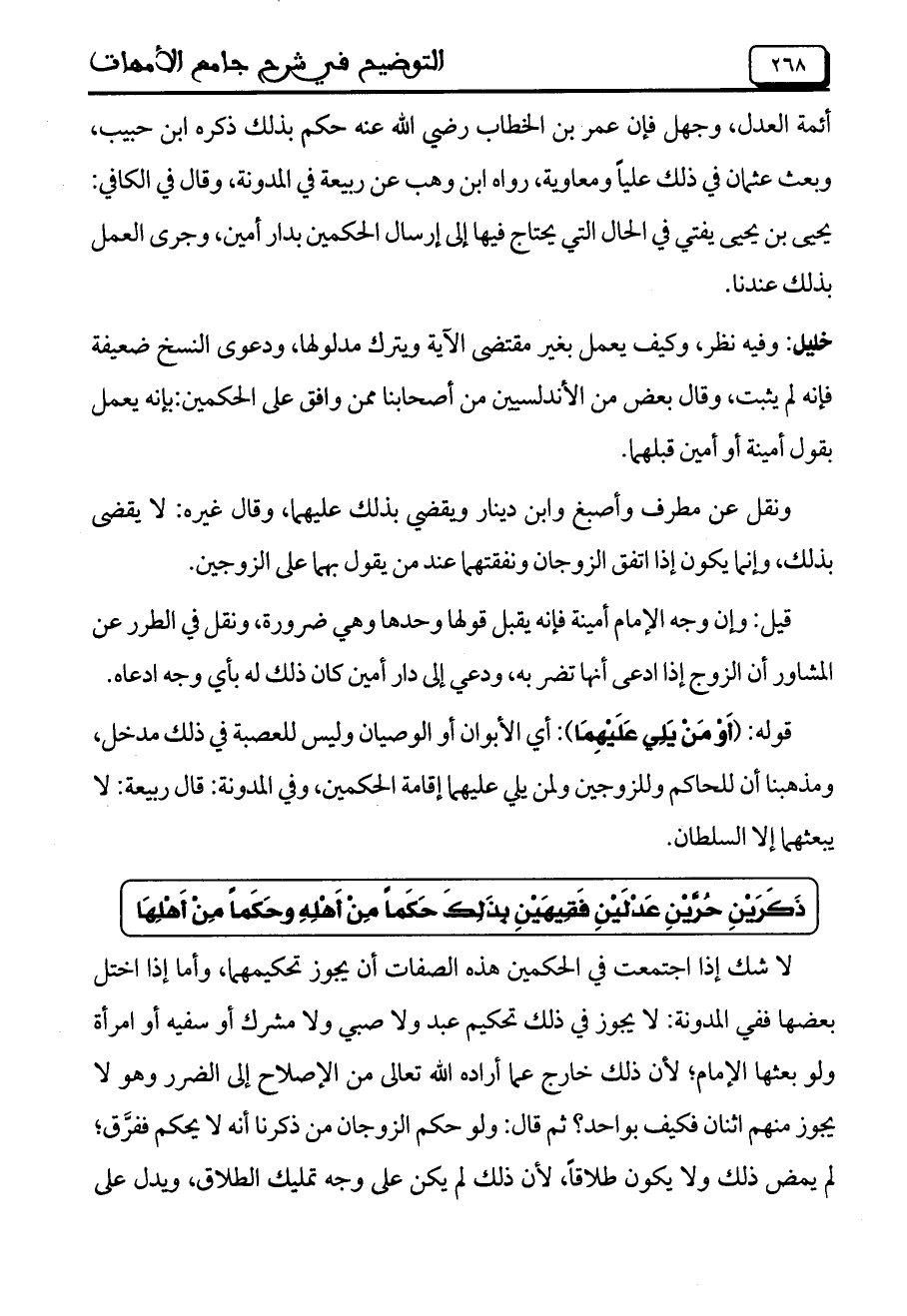 أئمة العدل، وجهل فإن عمر بن الخطاب رضي الله عنه حكم بذلك ذكره ابن حبيب، وبعث عثمان في ذلك علياً ومعاوية، رواه ابن وهب عن ربيعة في المدونة، وقال في الكافي: يحيى بن يحيى يفتي في الحال التي يحتاج فيها إلى إرسال الحكمين بدار أمين، وجرى العمل بذلك عندنا.