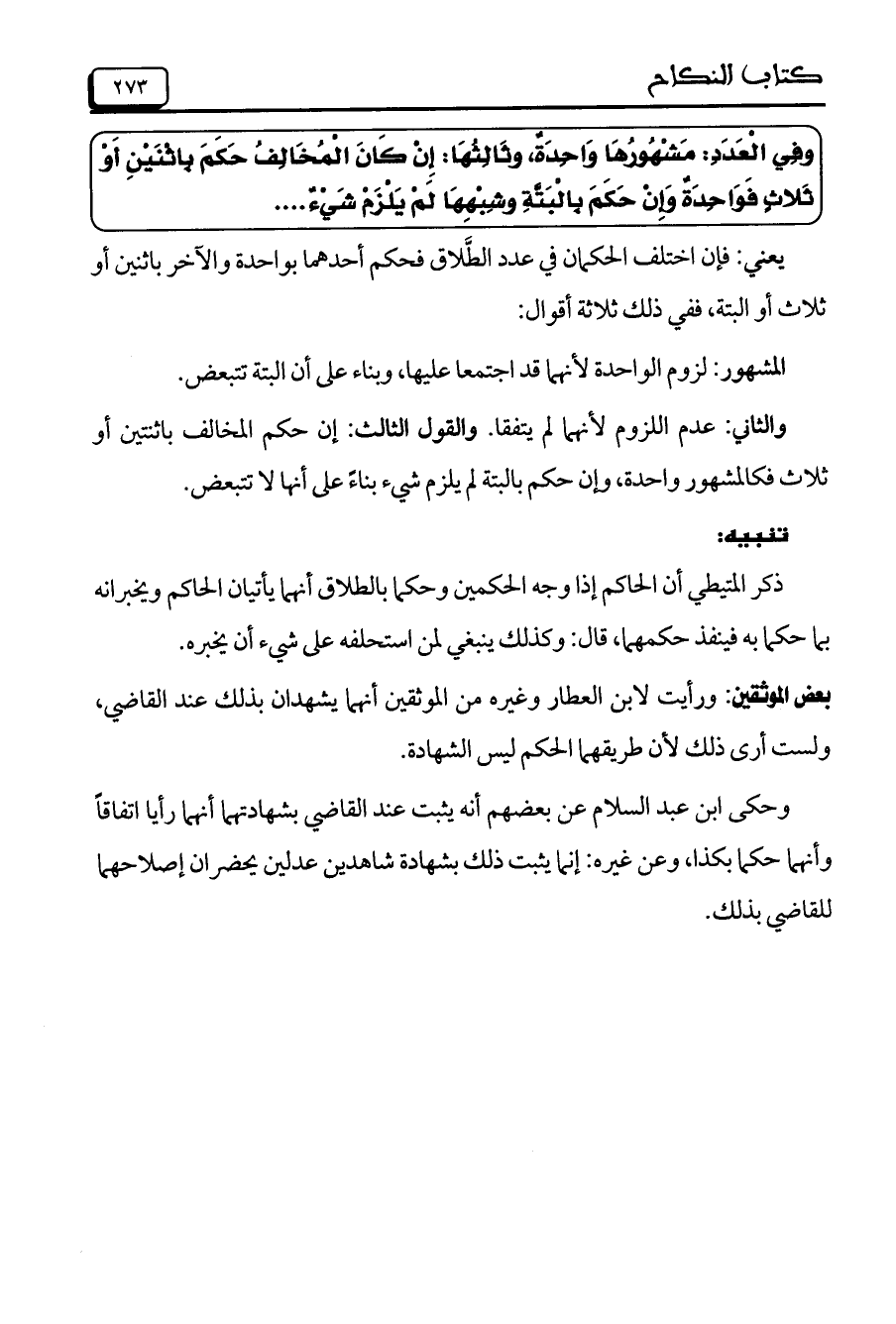 والثاني: عدم اللزوم لأنهما لم يتفقا. والقول الثالث: إن حكم المخالف باثنتين أو ثلاث فكالمشهور واحدة، وإن حكم بالبتة لم يلزم شيء بناءً على أنها لا تتبعض.