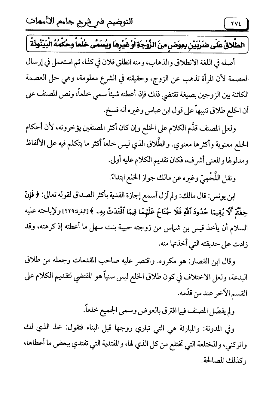 ولعل المصنف قدم الكلام على الخلع وإن كان أكثر المصنفين يؤخرونه، لأن أحكام الخلع معنوية وأكثرها معنوي. والطلاق الذي ليس خلعاً أكثر ما يتكلم فيه على الألفاظ ومدلولها والمعنى أشرف، فكان تقديم الكلام عليه أولى.