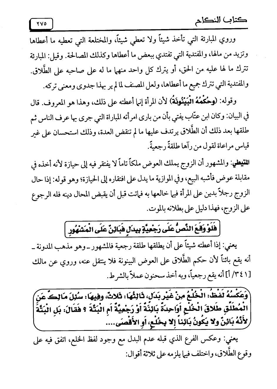 وقوله: (وحُكْمُهُ الْبَيْنُونَةُ) لأن المرأة إنما أعطته على ذلك، وهذا هو المعروف. قال في البيان: وكان ابن عتاب يفتي بأن من باري امرأته المباراة التي جرى بها عرف الناس ثم طلقها بعد ذلك أن الطلاق يرتدف عليها ما لم تنقض العدة، وذلك استحسان على غير قياس مراعاة لقول من رآها طلقة رجعية.