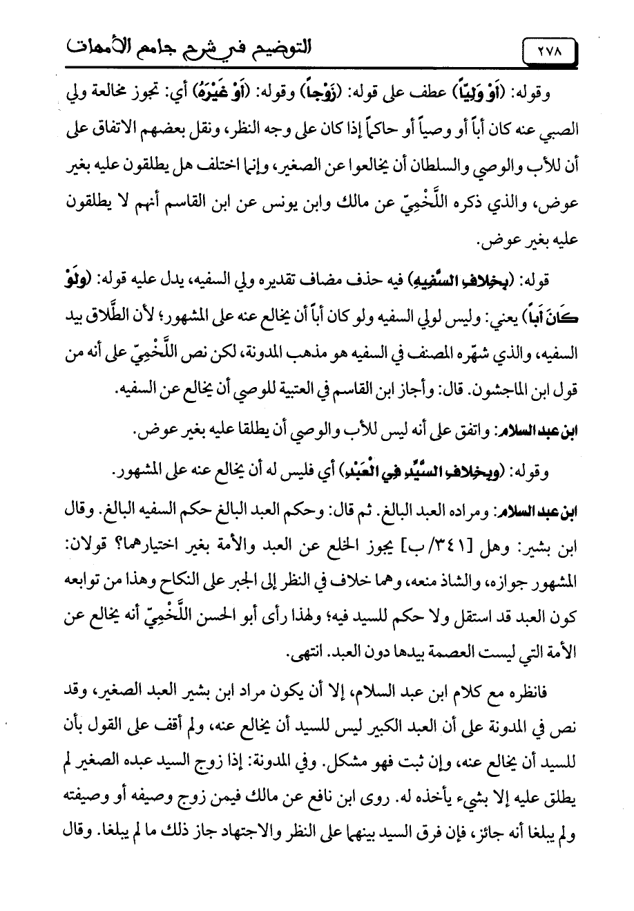ابن عبد السلام: ومراده العبد البالغ. ثم قال: وحكم العبد البالغ حكم السفيه البالغ. وقال ابن بشير: وهل [341/ ب] يجوز الخلع عن العبد والأمة بغير اختيارهما؟ قولان: المشهور جوازه، والشاذ منعه، وهما خلاف في النظر إلى الجبر على النكاح وهذا من توابعه كون العبد قد استقل ولا حكم للسيد فيه؛ ولهذا رأى أبو الحسن اللخمي أنه يخالع عن الأمة التي ليست العصمة بيدها دون العبد. انتهى.