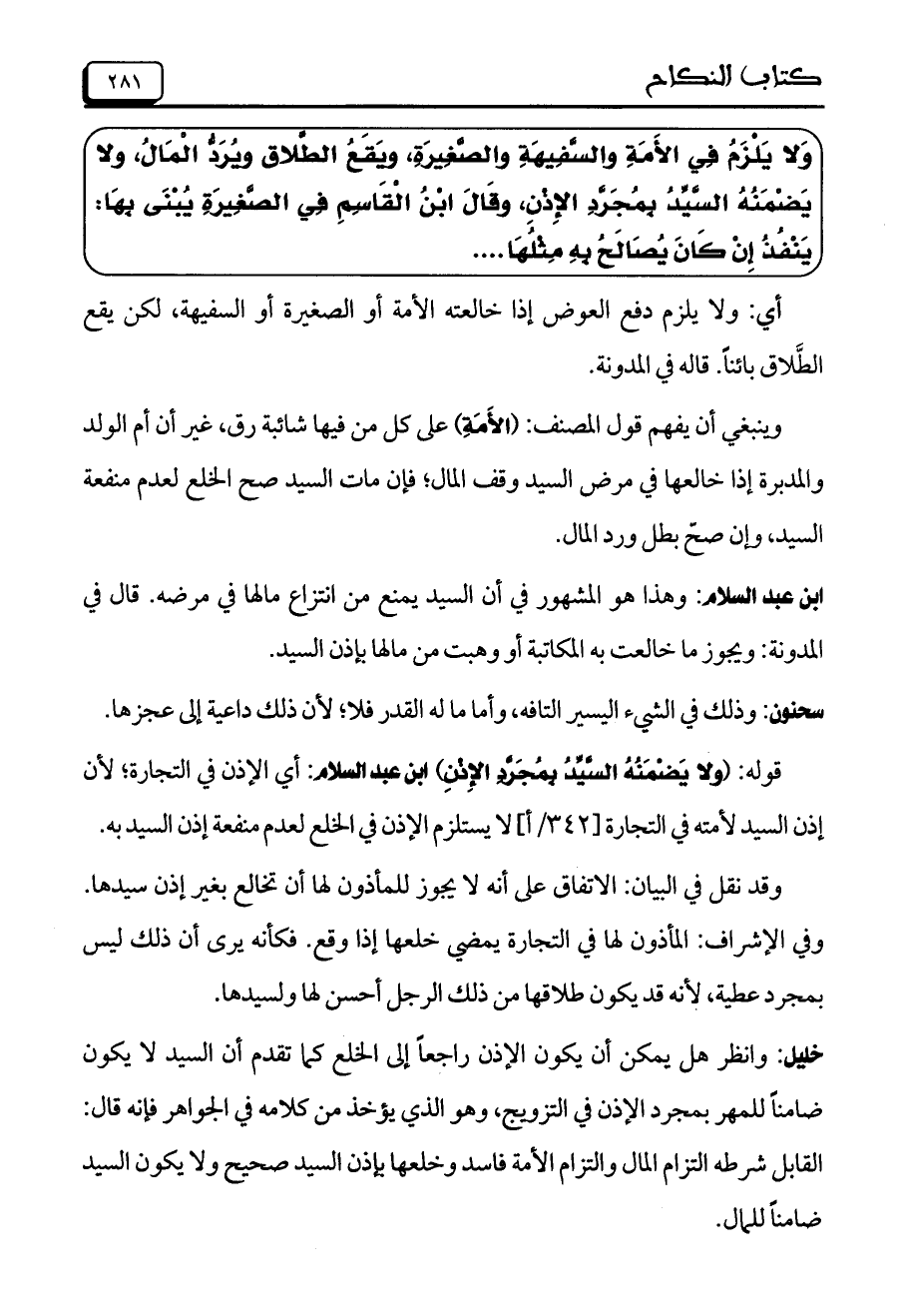 خليل: وانظر هل يمكن أن يكون الإذن راجعاً إلى الخلع كما تقدم أن السيد لا يكون ضامناً للمهر بمجرد الإذن في التزويج، وهو الذي يؤخذ من كلامه في الجواهر فإنه قال: القابل شرطه التزام المال والتزام الأمة فاسد وخلعها بإن السيد صحيح ولا يكون السيد ضامناً للمال.