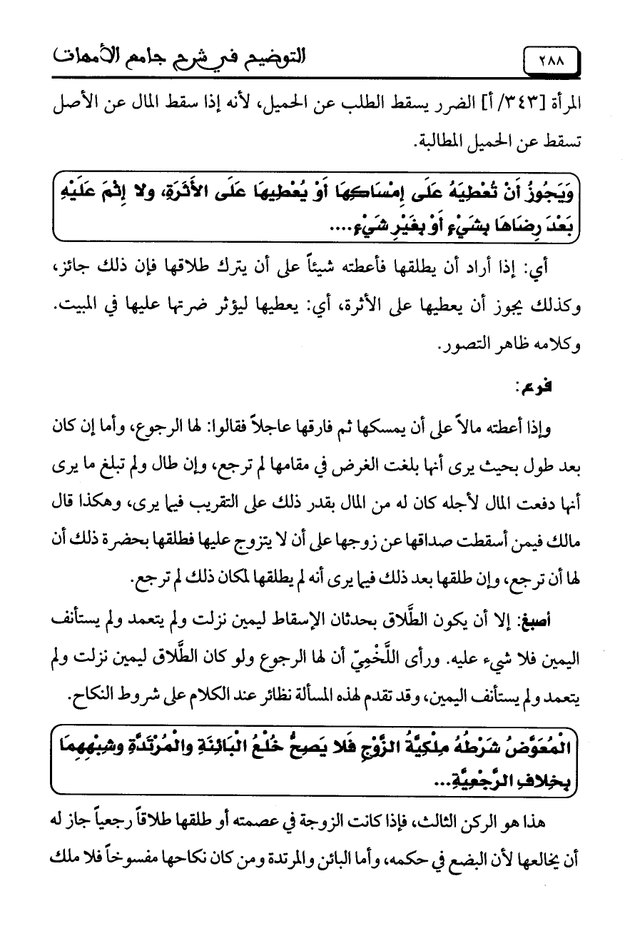 وَيَجُوزُ أَنْ تُعْطِيَهُ عَلَى إِمْسَاكِهَا أَوْ يُعْطِيهَا عَلَى الأَثَرَةِ، ولا إِثْمَ عَلَيْهِ بَعْدَ رِضَاهَا بِشَيْءٍ أَوْ بِغَيْرِ شَيْءٍ ..