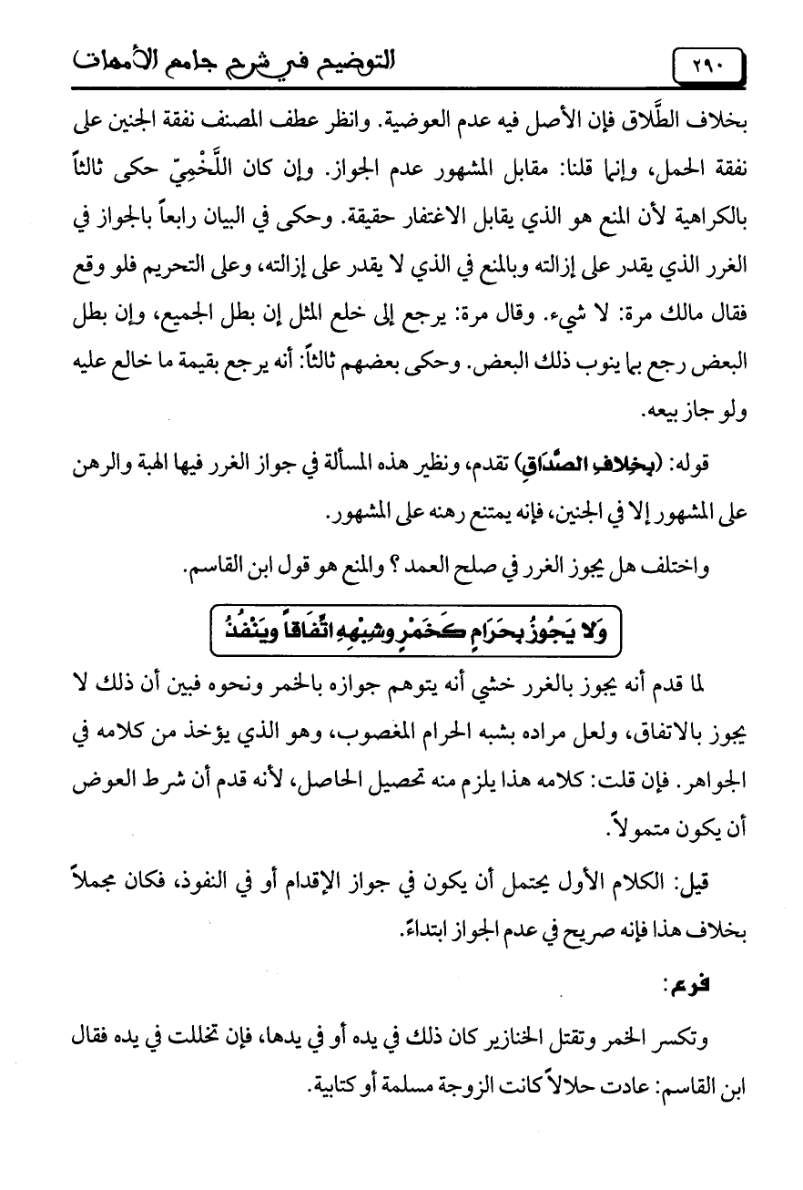 لما قدم أنه يجوز بالغرر خشي أنه يتوهم جوازه بالخمر ونحوه فبين أن ذلك لا يجوز بالاتفاق، ولعل مراده بشبه الحرام المغصوب، وهو الذي يؤخذ من كلامه في الجواهر. فإن قلت: كلامه هذا يلزم منه تحصيل الحاصل، لأنه قدم أن شرط العوض أن يكون متمولاً.