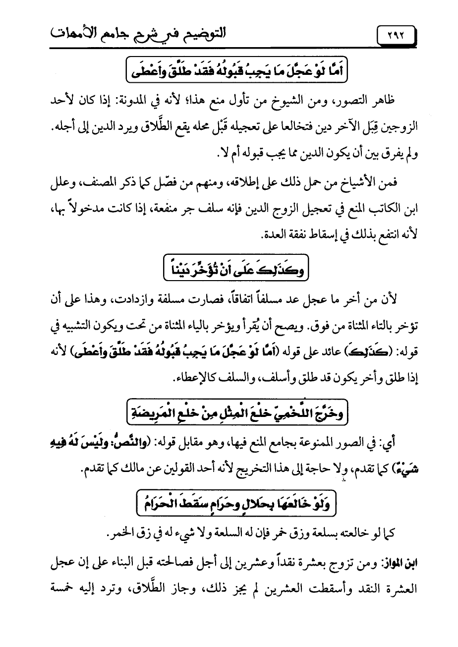 لأن من أخر ما عجل عد مسلفاً اتفاقاً، فصارت مسلفة وازدادت، وهذا على أن تؤخر بالتاء المثناة من فوق. ويصح أن يقرأ ويؤخر بالياء المثناة من تحت ويكون التشبيه في قوله: (وكَذَلِكَ) عائد على قوله (أَمَّا لَوْ عَجَّلَ مَا يَجِبُ قَبُولُهُ فَقَدْ طَلَّقَ وأَعْطَى) لأنه إذا طلق وأخر يكون قد طلق وأسلف، والسلف كالإعطاء.