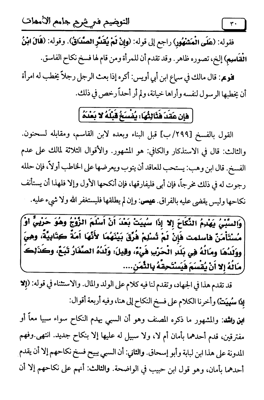 ابن راشد: والمشهور ما ذكره المصنف وهو أن السبي يهدم النكاح سواء سبيا معاً أو أو مفترقين، قدم أحدهما بأمان أم لا، ولا سبيل له عليها إلا بنكاح جديد. انتهى. وفهم المدونة على هذا ابن لبابة وأبو إسحاق. والثاني: أن السبي يبيح فسخ نكاحهم إلا أن يقدم أحدهما بأمان، وهو قول ابن حبيب في الواضحة. والثالث: أنهم على نكاحهم إلا أن
