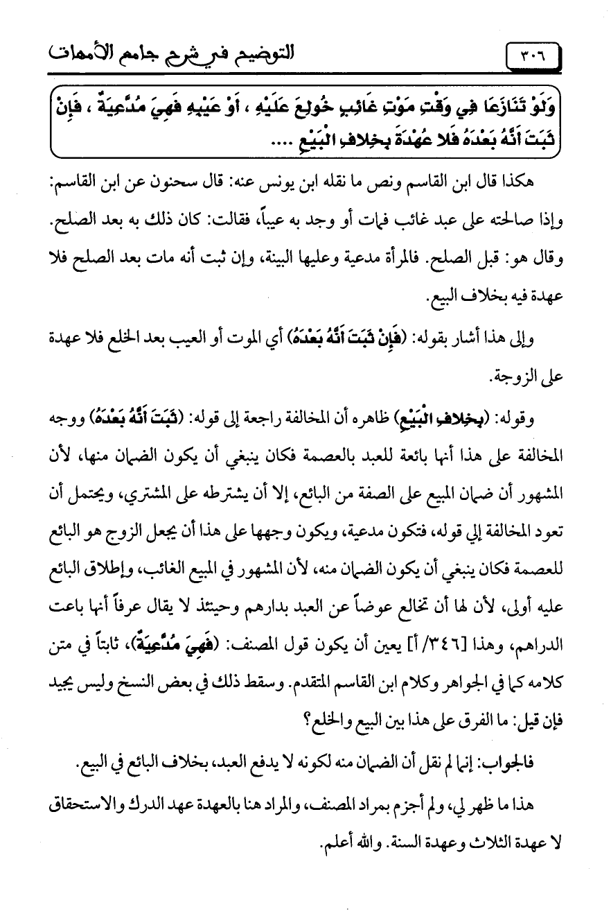 وقوله: (بِخِلافِ الْبَيْعِ) ظاهره أن المخالفة راجعة إلى قوله: (ثَبَتَ أَنَّهُ بَعْدَهُ) ووجه المخالفة على هذا أنها بائعة للعبد بالعصمة فكان ينبغي أن يكون الضمان منها، لأن المشهور أن ضمان المبيع على الصفة من البائع، إلا أن يشترطه على المشتري، ويحتمل أن تعود المخالفة إلى قوله، فتكون مدعية، ويكون وجهها على هذا أن يجعل الزوج هو البائع للعصمة فكان ينبغي أن يكون الضمان منه، لأن المشهور في المبيع الغائب، وإطلاق البائع عليه أولى، لأن لها أن تخالع عوضاً عن العبد بدارهم وحينئذ لا يقال عرفاً أنها باعت الدراهم، وهذا [346/ أ] يعين أن يكون قول المصنف: (فَهْيَ مُدَّعِيَةُ) ثابتاً في متن كلامه كما في الجواهر وكلام ابن القاسم المتقدم. وسقط ذلك في بعض النسخ وليس يجيد فإن قيل: ما الفرق على هذا بين البيع والخلع؟