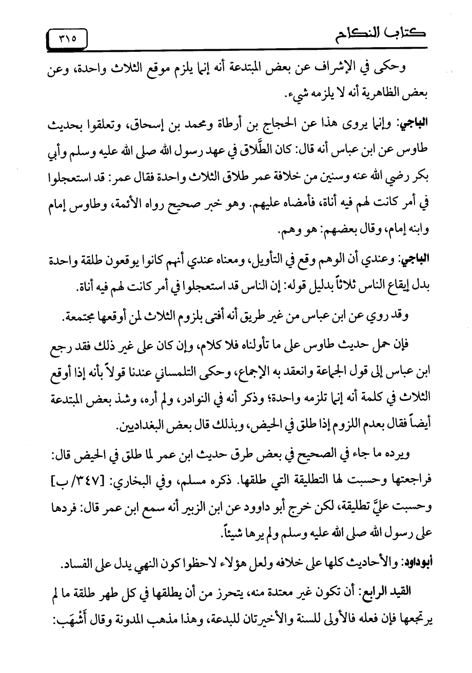 الباجي: وإنما يروى هذا عن الحجاج بن أرطاة ومحمد بن إسحاق، وتعلقوا بحديث طاوس عن ابن عباس أنه قال: كان الطلاق في عهد رسول الله صلى الله عليه وسلم وأبي بكر رضي الله عنه وسنين من خلافة عمر طلاق الثلاث واحدة فقال عمر: قد استعجلوا في أمر كانت لهم فيه أناة، فأمضاه عليهم. وهو خبر صحيح رواه الأئمة، وطاوس إمام وابنه إمام، وقال بعضهم: هو وهم.
