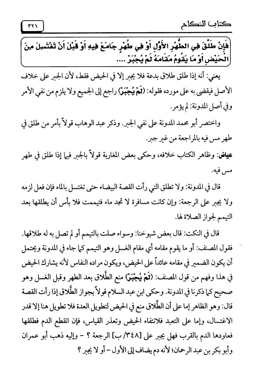 واختصر أبو محمد المدونة على نفي الجبر. وذكر عبد الوهاب قولاً بأمر من طلق في طهر مس فيه بالمراجعة من غير جبر.