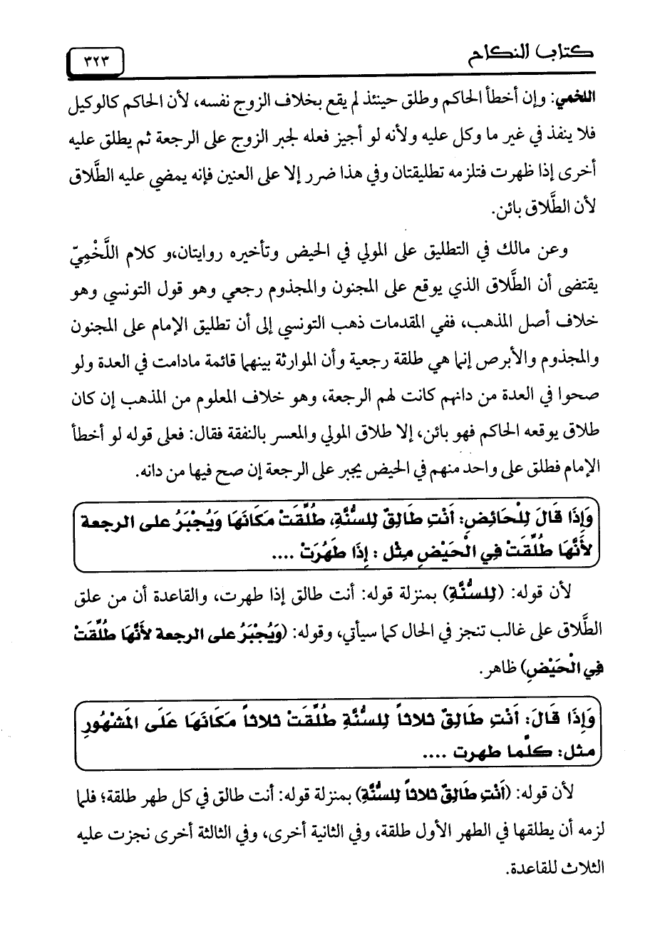 وَإِذَا قَالَ: أَنْتِ طَالِقُ ثلاثاً لِلسُّنَّةِ طُلِّقَتْ ثلاثاً مَكَانَهَا عَلَى الْمَشْهُورِ مثل: كلَّما طهرت ...