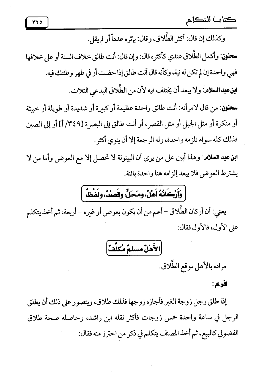 سحنون: وأكمل الطلاق عندي كأكثره قال: وإن قال: أنت طالق خلاف السنة أو على خلافها فهي واحدة إن لم تكن له نية، وكأنه قال أنت طالق إذا حضت أو في طهر وطئتك فيه.