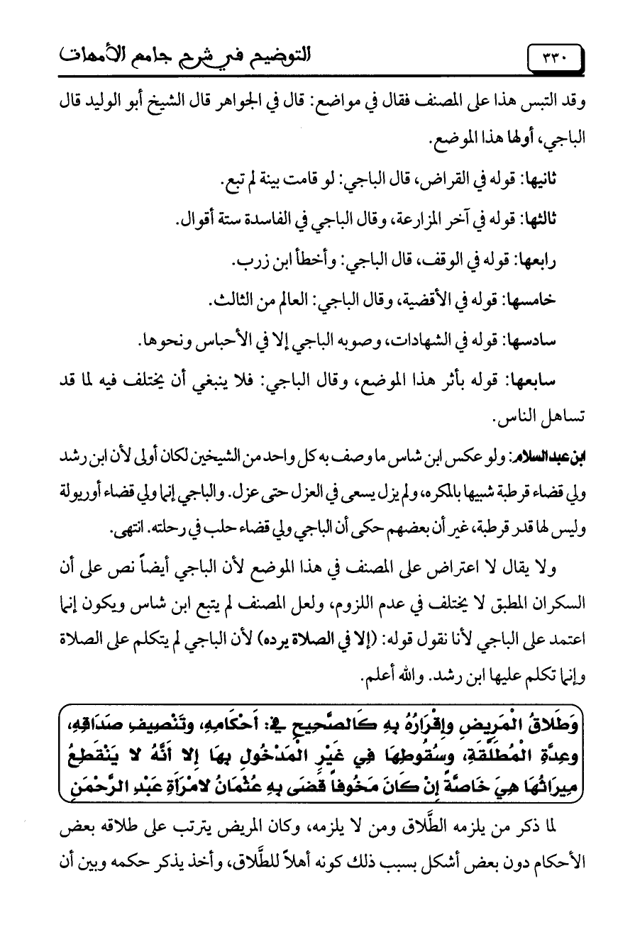 ولا يقال لا اعتراض على المصنف في هذا الموضع لأن الباجي أيضاً نص على أن السكران المطبق لا يختلف في عدم اللزوم، ولعل المصنف لم يتبع ابن شاس ويكون إنما اعتمد على الباجي لأنا نقول قوله: (إلا في الصلاة يرده) لأن الباجي لم يتكلم على الصلاة وإنما تكلم عليها ابن رشد. والله أعلم.