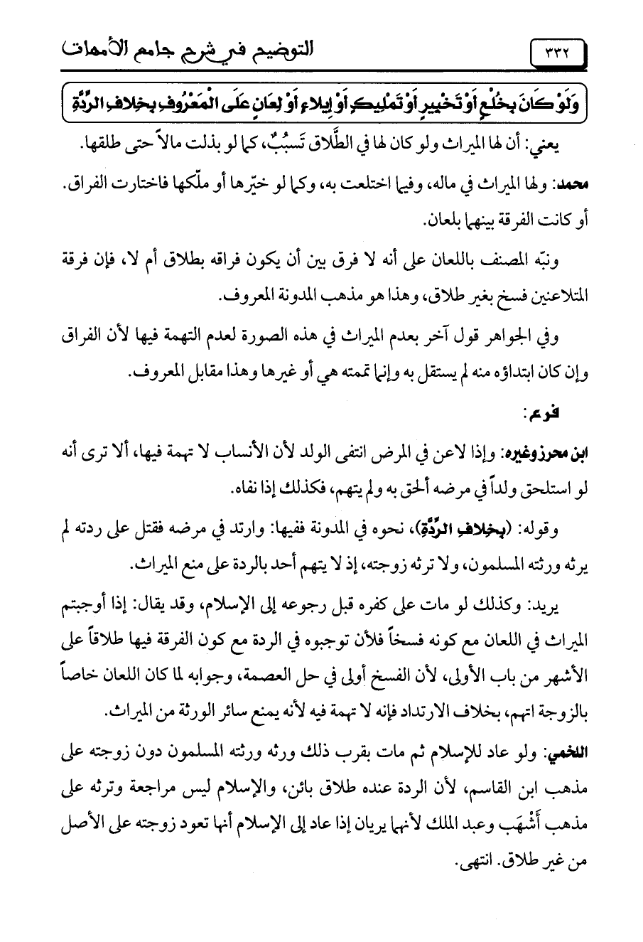 اللخمي: ولو عاد للإسلام ثم مات بقرب ذلك ورثه ورثته المسلمون دون زوجته على مذهب ابن القاسم، لأن الردة عنده طلاق بائن، والإسلام ليس مراجعة وترثه على مذهب أشهب وعبد الملك لأنهما يريان إذا عاد إلى الإسلام أنها تعود زوجته على الأصل من غير طلاق. انتهى.