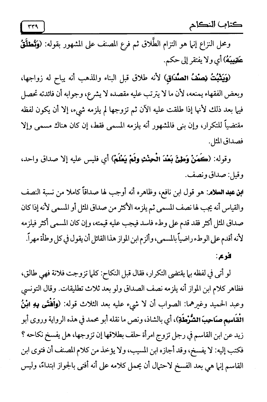 لو أتى في لفظه بما يقتضي التكرار، فقال قبل النكاح: كلما تزوجت فلانة فهي طالق، فظاهر كلام ابن المواز أنه يلزمه نصف الصداق ولو بعد ثلاث تطليقات. وقال التونسي وعبد الحميد وغيرهما: الصواب أن لا شيء عليه بعد الثلاث قوله: (وأَفْتَى بِهِ ابْنُ الْقَاسِمِ صَاحِبَ الشُّرْطَةِ) أي بالشاذ، ونص ما نقله أبو محمد في هذه الرواية وروى أبو زيد عن ابن القاسم في رجل تزوج امرأة حلف بطلاقها إن تزوجها، هل يفسخ نكاحه؟ فكتب إليه: لا يفسخ، وقد أجازه ابن المسيب، ولا يؤخذ من كلام المصنف أن فتوى ابن القاسم إنما هي بعد الفسخ لاحتمال أن يحمل كلامه على أنه أفتى بالجواز ابتداءً، وليس