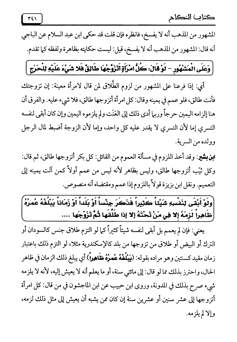 يعني: فإن لم يعمم بل أبقى لنفسه شيئاً كثيراً كما لو التزم طلاق جنس كالسودان أو الترك أو البيض أو طلاق من تزوجها من بلد كالإسكندرية مثلاً، لو التزم ذلك باعتبار زمان مقيد كسنتين وهو مراده بقوله: (يَبْلُغُهُ عُمرُهُ ظَاهِراً) أي يبلغ ذلك الزمان في ظاهر الحال، واحترز بذلك مما لو قال: إلى مائتي سنة، أو ما يعلم أنه لا يعيش إليه، لأنه لا يلزمه شيء صرح بذلك في المدونة، وروى ابن حبيب عن ابن الماجشون في من قال: كل امرأة أتزوجها إلى عشر سنين أو عشرين سنة إن كان ممن يشبه أن يعيش إلى مثل ذلك لزمه، وإلا لم يلزمه.