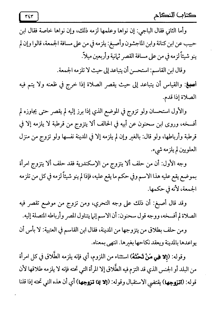 والأول استحسان ولو تزوج في الموضع الذي إذا برز إليه لم يقصر حتى يجاوزه لم أفسخه، وروى ابن سحنون عن أبيه في الحالف ألا يتزوج من قرطبة لا يلزمه إلا في قرطبة وأرباطها، ولو قال: بالغير وإن لم يلزمه إلا في المدينة نفسها ولو تزوج من منزل العلويين لم يلزمه شيء.