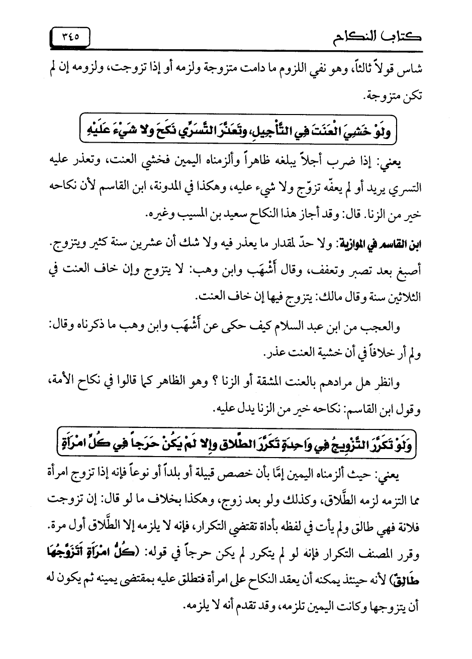 ابن القاسم في الموازية: ولا حد لمقدار ما يعذر فيه ولا شك أن عشرين سنة كثير ويتزوج. أصبغ بعد تصبر وتعفف، وقال أشهب وابن وهب: لا يتزوج وإن خاف العنت في الثلاثين سنة وقال مالك: يتزوج فيها إن خاف العنت.