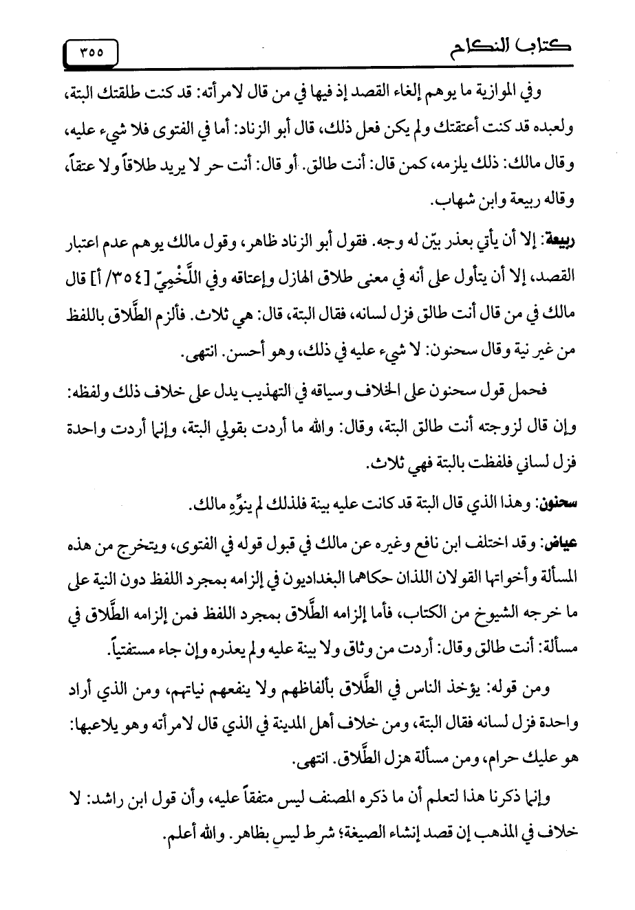 ومن قوله: يؤخذ الناس في الطلاق بألفاظهم ولا ينفعهم نياتهم، ومن الذي أراد واحدة فزل لسانه فقال البتة، ومن خلاف أهل المدينة في الذي قال لامرأته وهو يلاعبها: هو عليك حرام، ومن مسألة هزل الطلاق. انتهى.