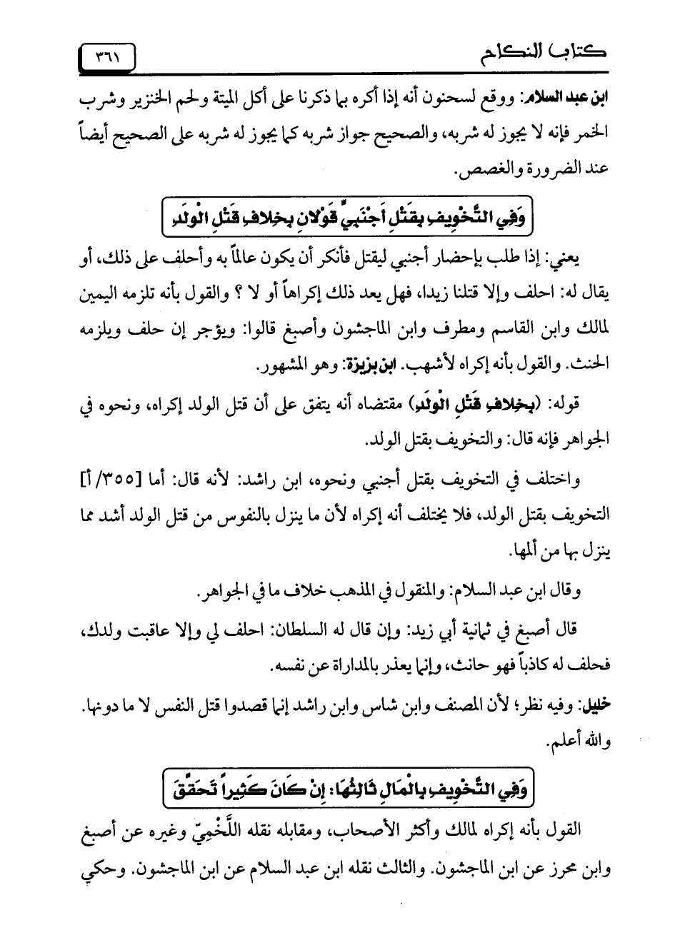 واختلف في التخويف بقتل أجنبي ونحوه، ابن راشد: لأنه قال: أما [355/ أ] التخويف بقتل الولد، فلا يختلف أنه إكراه لأن ما ينزل بالنفوس من قتل الولد أشد مما ينزل بها من ألمها.