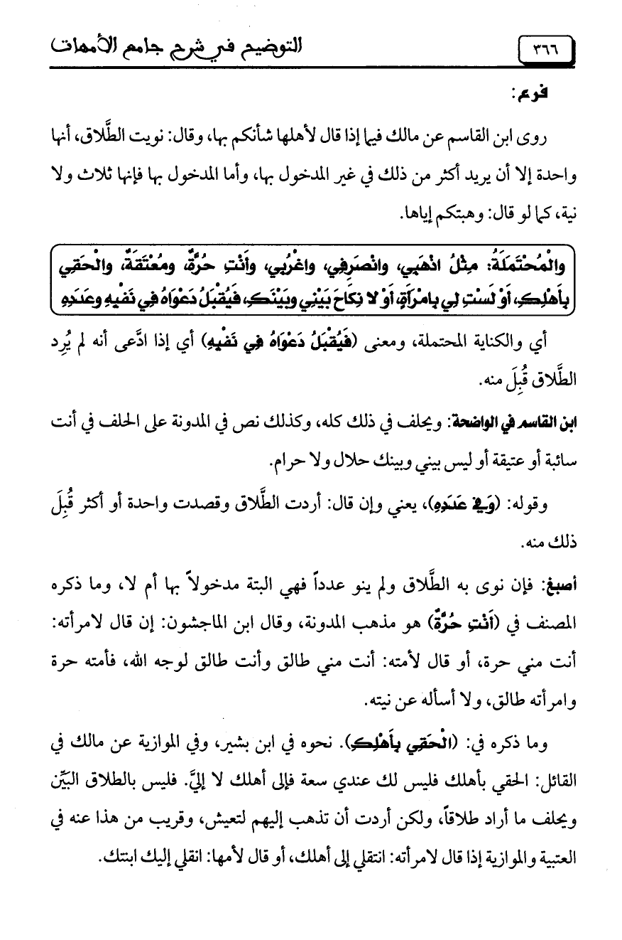 وما ذكره في: (الْحَقِي بِأَهْلِكِ) نحوه في ابن بشير، وفي الموازية عن مالك في القائل: الحقي بأهلك فليس لك عندي سعة فإلى أهلك لا إلي. فليس بالطلاق البين ويحلف ما أراد طلاقاً، ولكن أردت أن تذهب إليهم لتعيش، وقريب من هذا عنه في العتبية والموازية إذا قال لامرأته: انتقلي إلى أهلك، أو قال لأمها: انقلي إليك ابنتك.