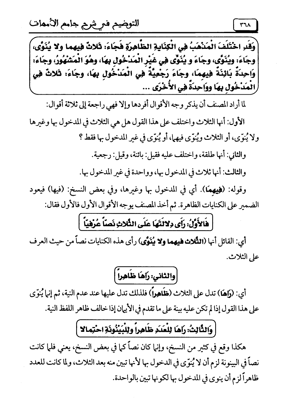 وَقَدِ اخْتَلَفَ الْمَذْهَبُ فِي الْكِنَايةِ الظَّاهِرَةِ فَجَاءَ: ثَلاثُ فِيهما ولا يُنَوَّى، وجَاءَ: ويُنَوَّى، وجَاءَ ويُنَوِّى فِي غَيْرِ الْمَدْخُولِ بِهَا، وهُوَ الْمَشْهُورُ، وجَاءَ: وَاحِدَةُ بَائِنَةُ فِيهِمَا، وجَاءَ رَجْعِيَّةُ فِي الْمَدْخُولِ بِهَا، وجَاءَ: ثَلاثُ فِي الْمَدْخُولِ بِهَا ووَاحِدَةُ فِي الأُخْرَى ..