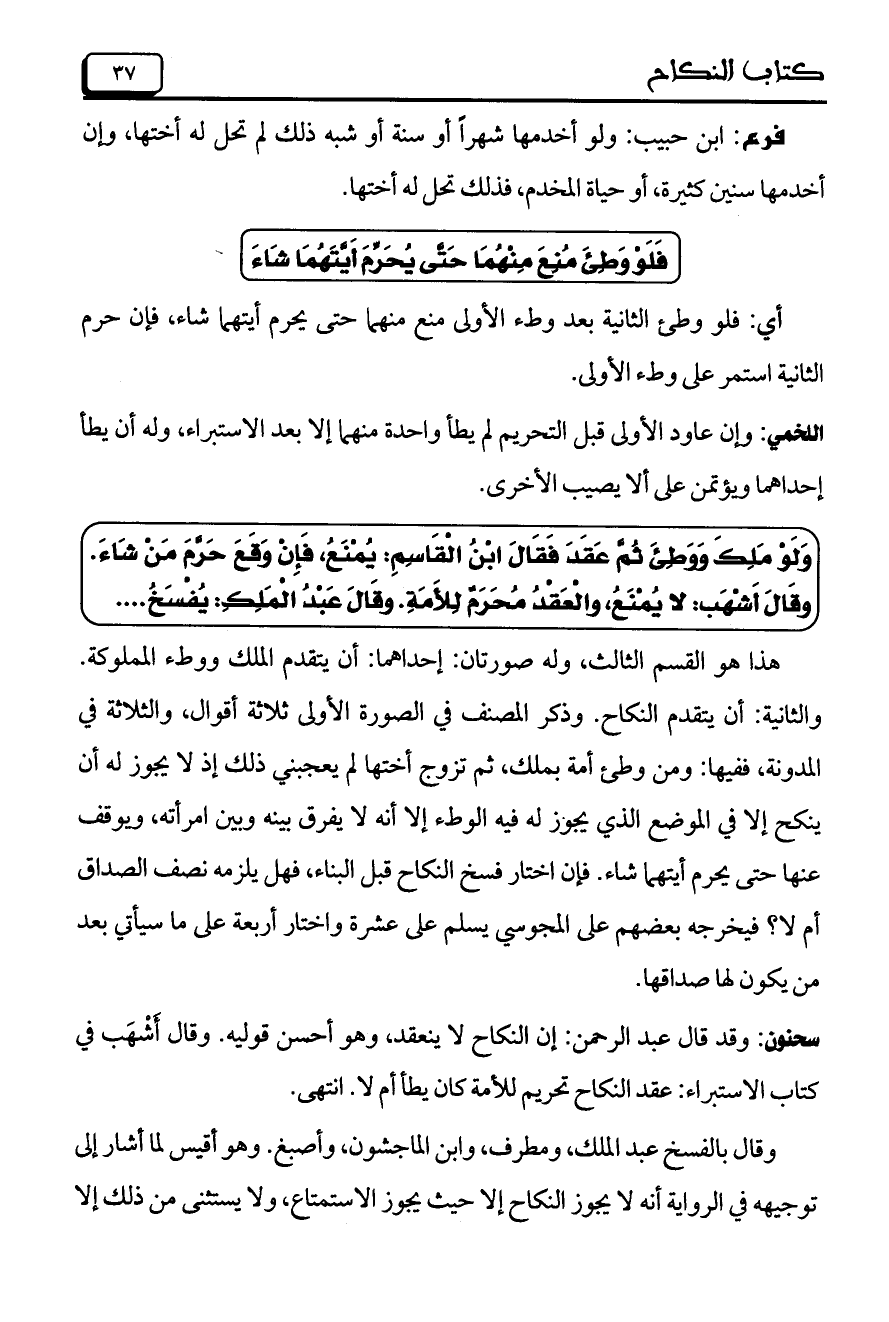 سحنون: وقد قال عبد الرحمن: إن النكاح لا ينعقد، وهو أحسن قوليه. وقال أشهب في كتاب الاستبراء: عقد النكاح تحريم للأمة كان يطأ أم لا. انتهى.