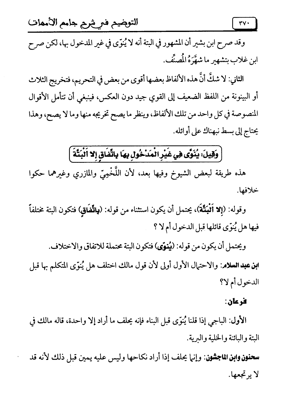 ابن عبد السلام: والاحتمال الأول أولى لأن قول مالك اختلف هل ينوى المتكلم بها قبل الدخول أم لا؟