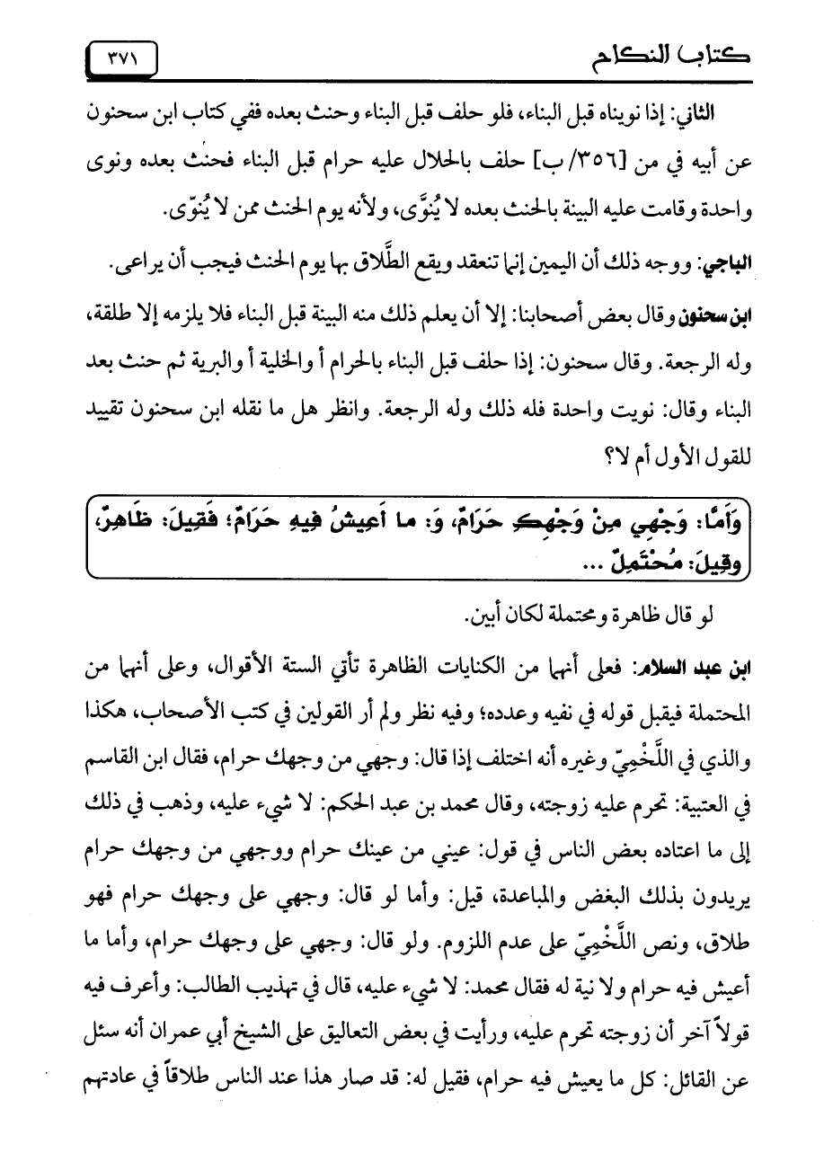 ابن عبد السلام: فعلى أنهما من الكنايات الظاهرة تأتي الستة الأقوال، وعلى أنهما من المحتملة فيقبل قوله في نفيه وعدده؛ وفيه نظر ولم أر القولين في كتب الأصحاب، هكذا والذي في اللخمي وغيره أنه اختلف إذا قال: وجهي من وجهك حرام، فقال ابن القاسم في العتبية: تحرم عليه زوجته، وقال محمد بن عبد الحكم: لا شيء عليه، وذهب في ذلك إلى ما اعتاده بعض الناسفي قول: عيني من عينك حرام ووجهي من وجهك حرام يريدون بذلك البغض والمباعدة، قيل: وأما لو قال: وجهي على وجهك حرام فهو طلاق، ونص اللخمي على عدم اللزوم. ولو قال: وجهي على وجهك حرام، وأما ما أعيش فيه حرام ولا نية له فقال محمد: لا شيء عليه، قال في تهذيب الطالب: وأعرف فيه قولاً آخر أن زوجته تحرم عليه، ورأيت في بعض التعاليق على الشيخ أبي عمران أنه سئل عن القائل: كل ما يعيش فيه حرام، فقيل له: قد صار هذا عند الناس طلاقاً في عادتهم