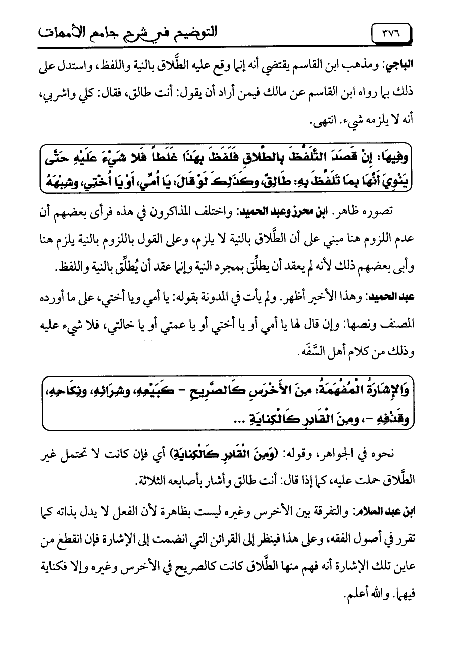 ابن عبد السلام: والتفرقة بين الأخرس وغيره ليست بظاهرة لأن الفعل لا يدل بذاته كما تقرر في أصول الفقه، وعلى هذا فينظر إلى القرائن التي انضمت إلى الإشارة فإن انقطع من عاين تلك الإشارة أنه فهم منها الطلاق كانت كالصريح في الأخرس وغيره وإلا فكناية فيهما. والله أعلم.