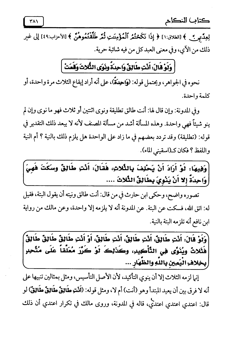 وَفِيهَا: لَوْ أَرَادَ أَنْ يَحْلِفَ بِالثَّلاثِ، فَقَالَ: أَنْتِ طَالِقُ وسَكَتَ فَهِيَ وَاحِدَةُ إِلا أَنْ يَنْوِيَ بِطَالِقُ الثَّلاثَ ..